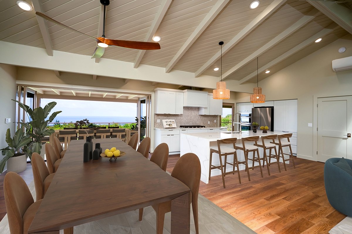 Discover the allure of a newly renovated and expanded home in Kona Heavens, offering approximately 3,350 square feet of luxurious living space. This stunning property, which has not been occupied since its transformation, exudes the essence of brand-new construction both inside and out.Modern Upgrades: Enjoy top-of-the-line Samsung appliances, split AC in all living areas and bedrooms, a new roof, updated electrical and plumbing systems, and luxury flooring. The home also boasts quartz countertops, Lutron lighting, and custom cabinetry throughout.Spacious Layout: With 4 bedrooms, 3 full baths and 2 half baths, this home provides ample space for comfortable living. The ground floor features two distinct wings, including a large media room, an en-suite bedroom, and a versatile bonus space with a half bath, perfect for a workspace or gym.Elegant Design: Ascend the modern stairway with its floor-to-ceiling glass landing to the open-concept living, dining, and kitchen area, which seamlessly extends to an oversized lanai. The primary suite offers a generous walk-in closet and an ocean-view bathroom with a soaking tub and walk-in shower.Breathtaking Views: The lanai presents sweeping ocean views along the Kona coastline, providing a picturesque setting for daily sunsets from your expansive outdoor living area.Outdoor Potential: The property is surrounded by expansive lawns and gardens, ideal for future enhancements such as a pool, and is situated on a private corner lot, offering ultimate privacy.This rare offering of $761 per sqft for a newly renovated home on one acre in Kona is astounding. Modern luxury coupled with unparalleled privacy and breathtaking views. Experience the perfect blend of indoor and outdoor living in this exceptional property.