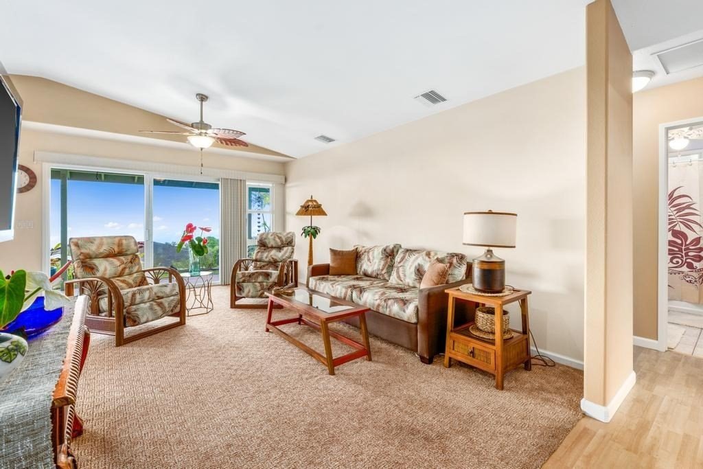 Single family home without any stairs offers great ocean views and breezes. Located in Kalaoa Terrance a small, private, quiet, and well-maintained community. The lanai and most rooms have amazing views. Some rooms freshly painted. The most sought after floor plan with the master en-suite on one side of the home with the guest rooms on the other. Master suite door offers complete privacy when closed. Ceiling fans throughout, central AC, owned Photovoltaic with 14 solar panels and security system (currently not in use). Beautiful laminate wood flooring, tile, new carpet, bamboo window coverings, and granite counter tops. Tranquil lush landscaping with rock walls and vinyl fencing. Cooler 1300' elevation with tropical breezes. Landscaping includes grass, shrubs, tropical Hawaiian flowers, and avocado trees. Sprinkler system on timer.