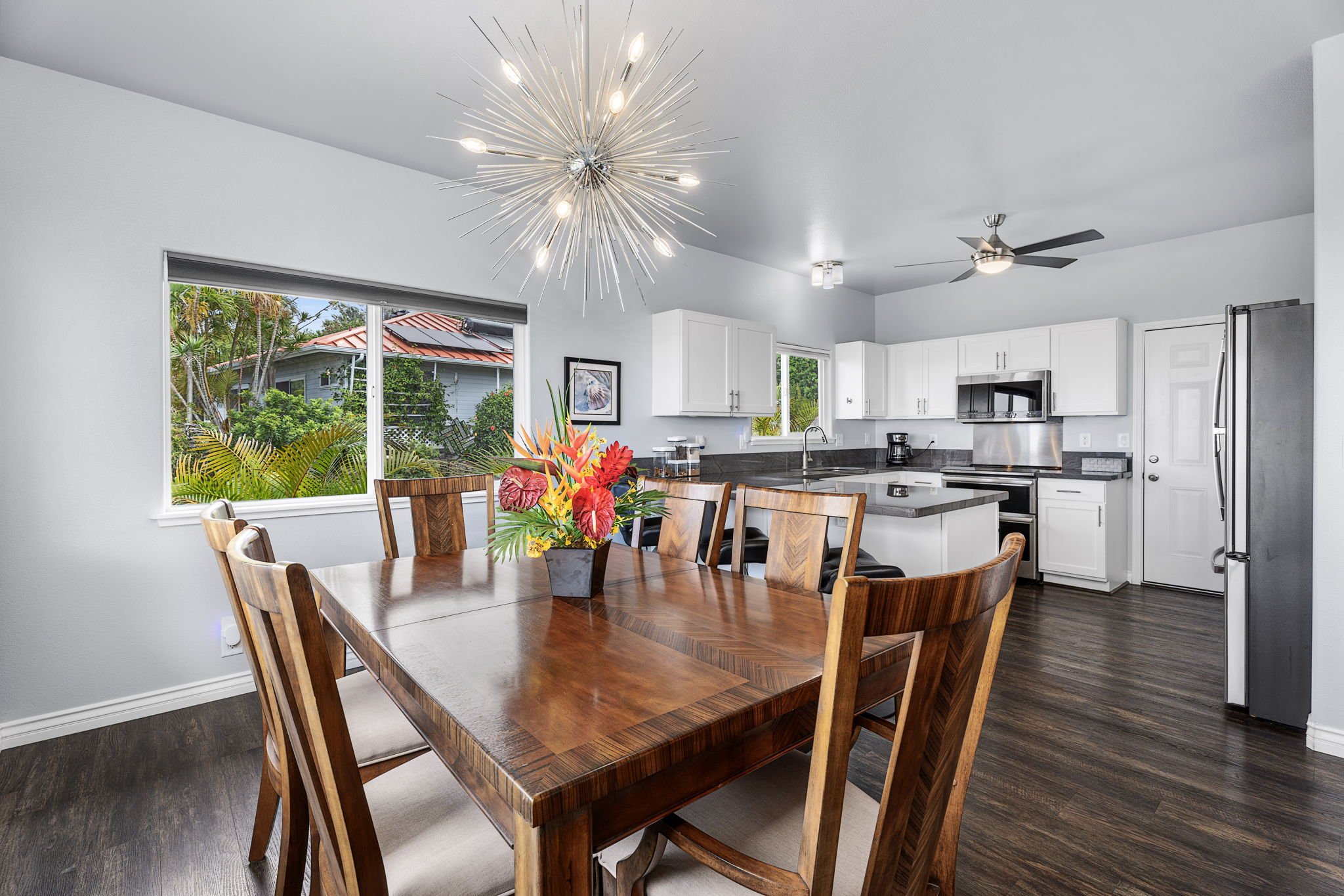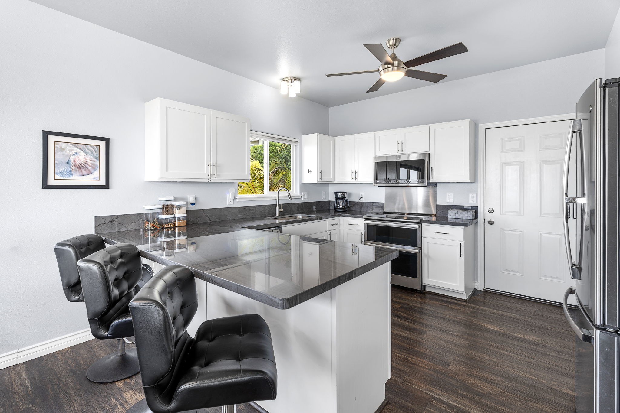 Back on the market no fault of the Sellers.This lovely single level home is situated above the Kona airport at a perfect elevation where you will be able to enjoy the beautiful trade winds by day & cool mountain breezes at night.The exterior of this home has a very low maintenance yard, for that carefree life style. Interior shows pride of ownership. Kitchen has quartzite counters & GE Profile stainless steel appliances. Both bathroom have been upgraded including a Brondell wash-let & Bluetooth connectivity for music. Living room has Cali vinyl flooring, and a corner electric fireplace that is wonderful for those cool evenings after watching those amazing sunset from the lanai.There is an abundance of windows; ocean views can be seen from nearly every room in the home. There are custom blinds along with premium Cali vinyl planking throughout. Home is being sold furnished for an easy move in.Two car garage is situated off the kitchen making it easy access for coming home with your groceries.Sellers have added solar with Sunrun there are 11 panels of solar on the roof with 1tesla battery. There is also a plug in the garage for an electric car. This is a leased system.