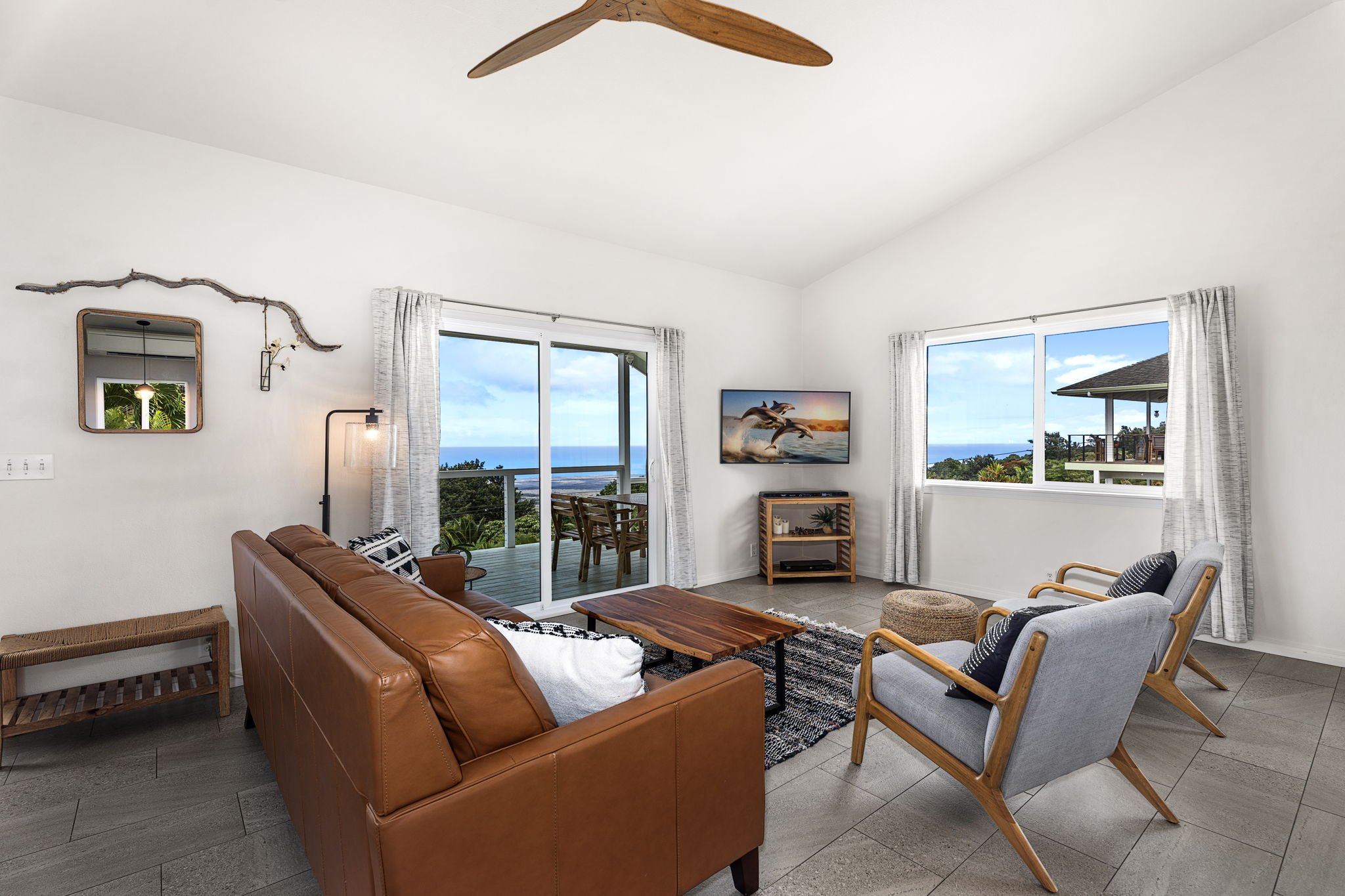 Stunning Kona Home with Unobstructed Ocean Views & Modern Upgrades! Discover paradise in this immaculate 3-bedroom, 2-bathroom home in Kona, boasting breathtaking, un-blockable ocean views at an ideal elevation. The upstairs features a spacious living area, while a separate downstairs guest suite with a kitchenette offers flexibility for visitors or rental potential. Landscaping with areca palms, sharwil avocado, mango, meyer lemon, Tahitian lime, white pineapples, apple bananas, papaya, plus vibrant plants, shrubs, rock walls, concrete steps, and cable fencing.Improvements (2018-2024): New diamond maple cabinets with rain glass, premium countertops, backsplashes, stainless steel appliances (refrigerator, stove, hood, dishwasher), mega-capacity washer/dryer, stainless sinks, garbage disposals, and modern faucets. New water lines/hoses, water filter system, 5500-watt hot water heater, rebuilt toilets (2023), jet-snaked drain pipes, and all new shut-off valves. New glass entry doors, mirrored closet doors, custom garage shelving, all-new floor tile with 1/2" HardieBacker underlayment, and updated interior/exterior light fixtures and ceiling fans. New Cat5 wiring for TV, kitchen, and 2nd bedroom, commercial-grade cable lines for faster internet, Orbi modem/router with satellite, and Reolink security camera system. New corrugated metal roof, R13 attic insulation, Boricare treatment on attic wood and cabinets, hurricane gable-end bracing, new exterior attic vents, 3-zone mini-split AC, and all-new double-pane Pella windows and patio doors. Freshly repainted in 2024, new mailbox, post, and gravel landscaping for low maintenance. Upgraded deck with enhanced bracing and new posts, ideal for soaking in the views. This Kona gem is ready for you to move in and enjoy the ultimate Hawaiian lifestyle.Additional photos and video at: https://hawaiian-virtual-tours.aryeo.com/sites/opnpjbe/unbranded