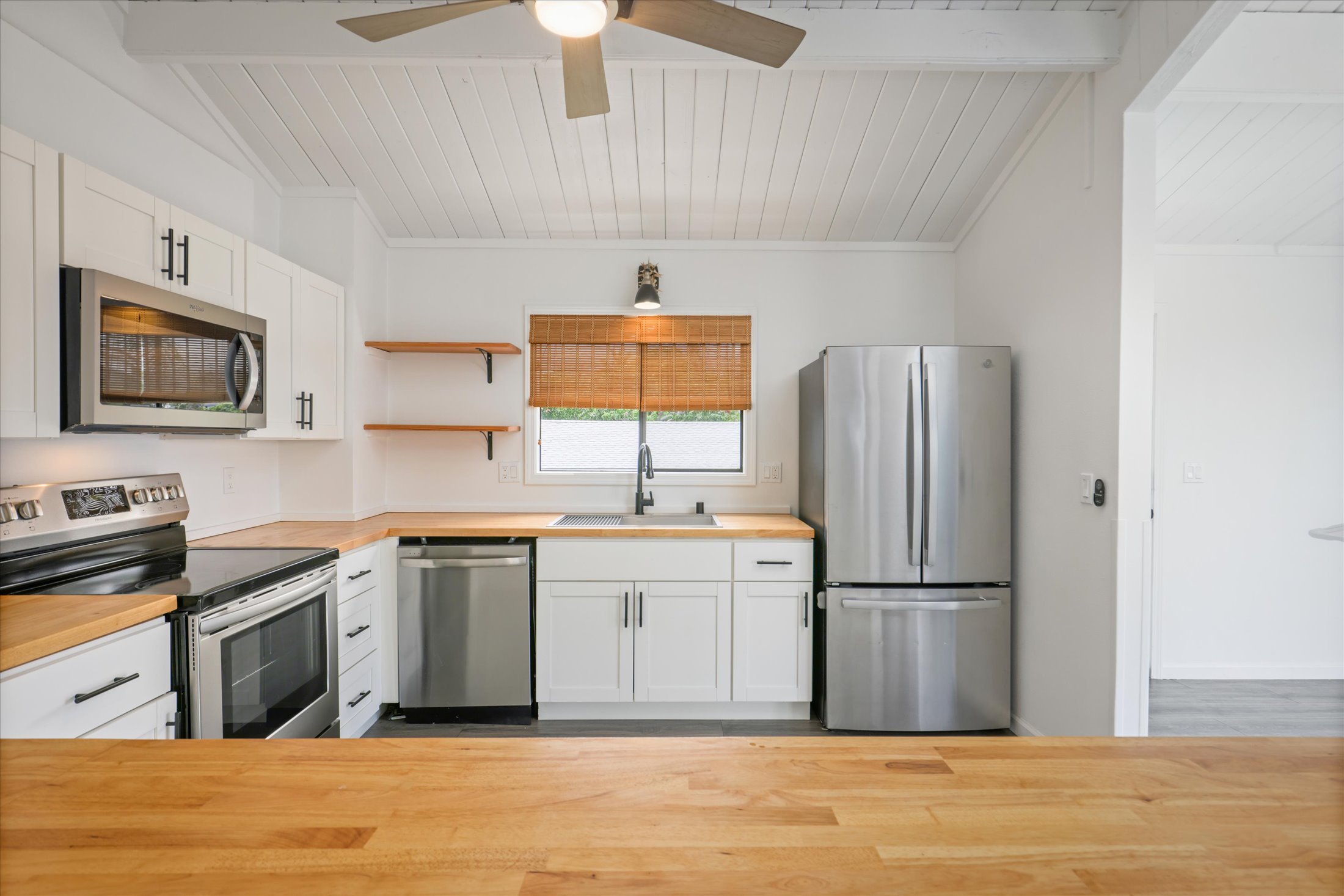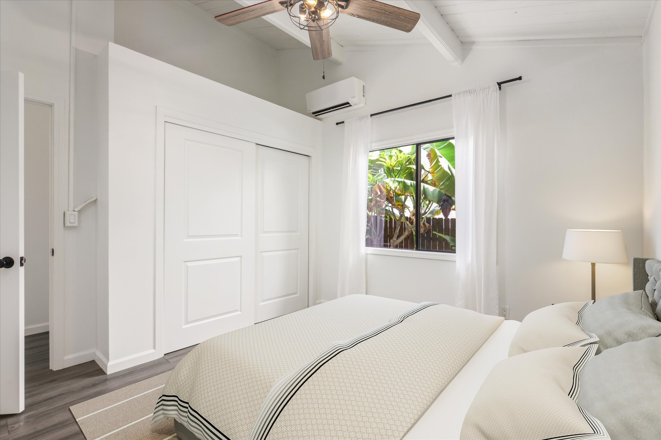 Beautifully remodeled in 2021 this 5 bedroom 4 bath property is a rare find offering flexible living arrangements and/or immediate rental income, ocean views, lush tropical landscaping with mature fruit trees and room for a pool!Consisting of 3 bedrooms and 2 baths, the main home features vaulted ceilings, large windows for natural light and a split AC system to keep you cool on warmer summer days. The living area opens to the lanai where you can take in the ocean views and colorful Kona sunsets. Beyond the lanai is the fenced and private backyard with flowering heliconia and mature fruit trees. The modern farm house kitchen provides ample counter space, new cabinetry open shelving and stainless steel appliances.The vaulted ceilings and large windows continue into the studio and stand alone 1 bedroom 1 bath which both have their own and separate entrances. The stand alone 1/1 also includes a split AC system.With the main home set back from the road, the long driveway provides ample parking. Additional parking is conveniently available along the street.Leased Sunrun solar system with approved county permits ready to install should the new owners choose.