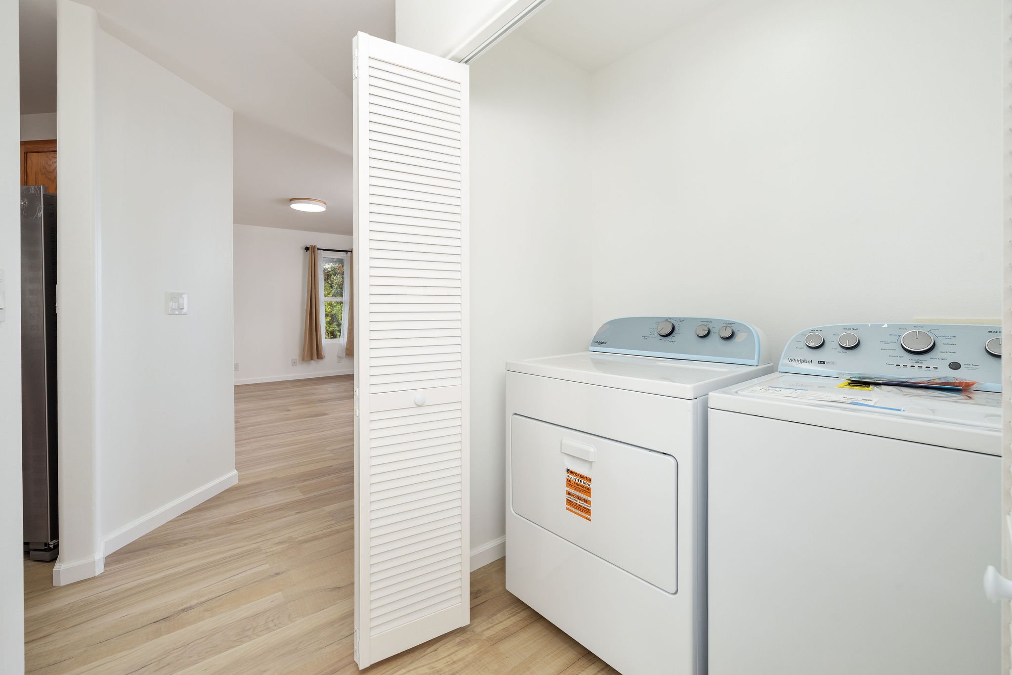 From the living room, enjoy a tranquil ocean view, offering the perfect backdrop for your morning coffee or evening wind-down. Outside, the home is framed by beautiful Hawaiian rock walls, with grassy areas ideal for gardening, lounging, or pets. The enclosed carport provides generous space for parking, storage, or even a workshop.
