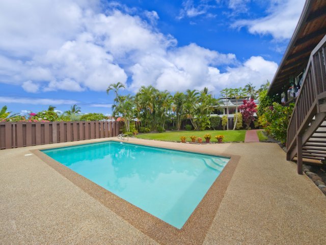 Experience Quintessential Hawaiiana Living with Ocean Views and Large In-ground Pool in Kona Palisades!Welcome to this charming 4-bedroom, 2-bathroom home, ideally situated in the desirable Kona Palisades Subdivision. With open beam ceilings, spacious loft and an additional bonus room, this residence offers a blend of island charm and ambiance. Savor the lovely ocean views from the kitchen window surrounded by beautiful cherry wood cabinetry, providing ample storage space for all your needs. Relax, entertain and enjoy the beautiful ocean views on the large covered lanai, which overlooks the generously sized in-ground pool. The grassy front yard and private back yard are fully fenced, featuring an abundance of meticulously cared-for tropical plants on a drip irrigation system. Pick fresh mangoes or avocados right from the trees as you bask in the sunshine and cool breezes. The grassy back yard with in-ground chlorinated pool provides ample space for extended entertaining, activities, and fun. The spacious primary bedroom includes its own private access to the lanai, providing a seamless transition to outdoor relaxation. The original owners have lovingly maintained this property with great pride and joy. Come take a look at this classic home that captures the true essence of Hawai'i living. Kona Palisades is conveniently located near the Kailua Kona airport, white sandy beaches, schools, healthcare, and shopping.Notable Features: - New shingle roof replaced in 2023 - New solar hot water system as of 2023 - In-ground chlorine pool - Sunshades on lanai to minimize sun exposure - Three car garage - Ocean, horizon and sunset views from lanai and kitchen - Spacious upstairs loft and large bonus room - A central vacuum system located in garage - Attic ventilation fans for additional cooling - Interior laundry area