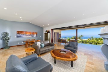 Each of the residence’s three bedrooms has its own bathroom to ensure guest privacy, and the master suite features an outdoor spa outside its sliding pocket doors and outdoor shower garden with natural stone privacy walls.