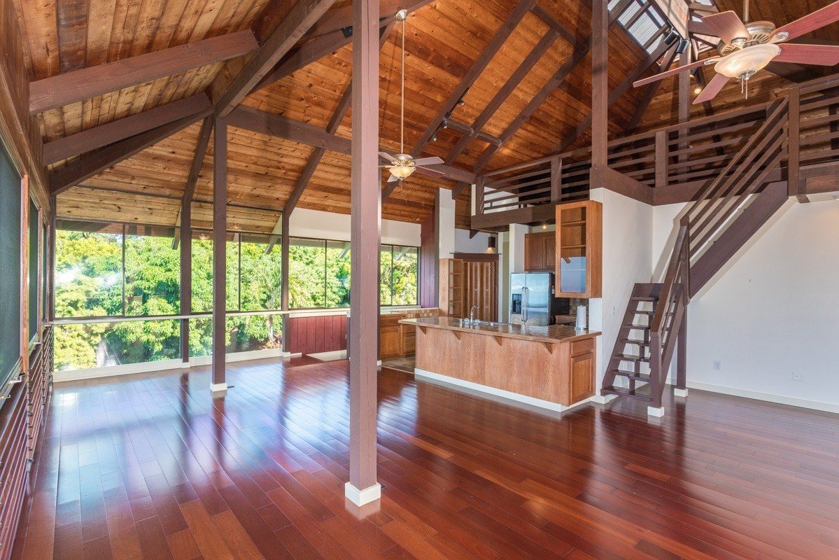 Remarkable location and value. Recently created by a minor land division this up-country home offers so much for the the money. Over 3 acres of gated mature Mac-Nut trees and endless 180 degrees ocean and sunset views with privacy. This house features Photo Voltaic, Wood floors, Open wood-beam ceilings, two living rooms, plus an upper loft and 4+ carport. Absolutely jaw-dropping 180 degree coastline views from this home. Plenty of level grassy lawn space, for any activity or improvements, including a pool.This home has had some updating over the years and is in mostly original condition with a few exceptions. Explore the endless possibilities that abound, with this versatile floor plan.This is an exceptional value at this price, as similar properties with this type of location and attributes sell for thousands more. The pictures and tour offer a good overview of this home and property, but the ambiance and peacefulness must be experienced in person to be appreciated.Being sold as is. County has all records of recent lot division. Separate water meter, cesspool and electric meter.