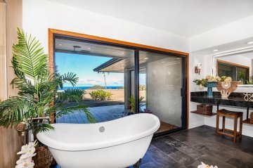 Discover a unique landscape of natural beauty like no other with this unique opportunity to own a 7,068 sqft estate on a sprawling 3.2 acres. Built by a renowned resort builder as his own private residence. The main home features 5 bedrooms and 5.5 baths, soaring 12-19 ft ceilings, with expansive windows framing sweeping ocean views. On the main level, retreat to your choice of three guest rooms. These guest suites each with ensuite baths and walk-in closets ensure exceptional comfort for family and visitors. Additional versatility is offered with a loft-style office, and other flexible living spaces. In the heart of the home rests a striking double-sided fireplace. Towering Mahogany pocketing doors open wide to panoramic views on two spacious lanais. The chef’s kitchen is a true showpiece featuring sophisticated design with premium craftsmanship. Luxurious finishes such as Van Gogh granite countertops, ribbon-grain mahogany cabinetry, and top-tier appliances. The primary suite provides a true retreat with an outdoor shower and private spa overlooking the coastline. Additional features include a detached one-bedroom guest house with its own bedroom, bathroom, wet bar and garage.