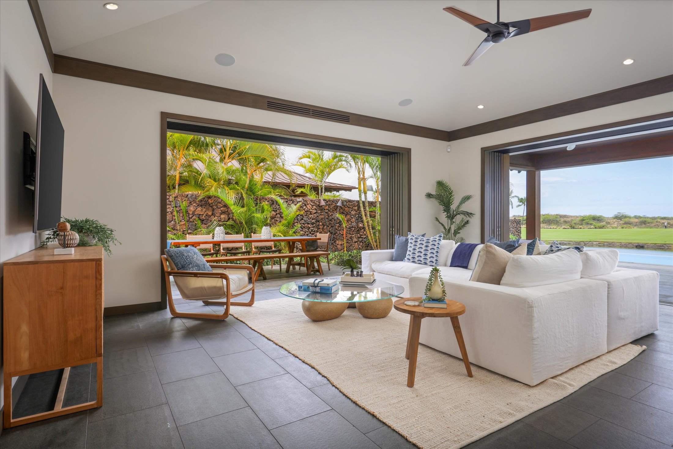 Custom mahogany pocket doors open the great room to a spacious covered lanai, creating a seamless indoor-outdoor living experience—perfect for entertaining or relaxing in the peaceful Kona breeze.