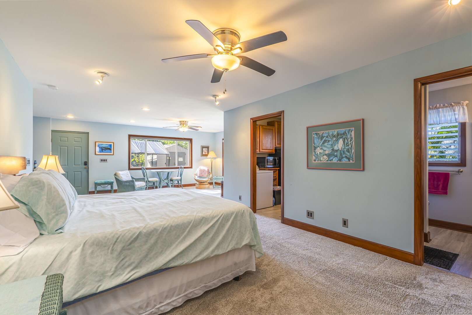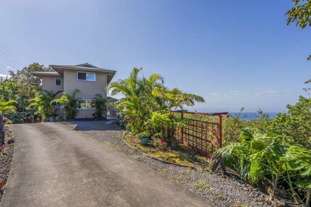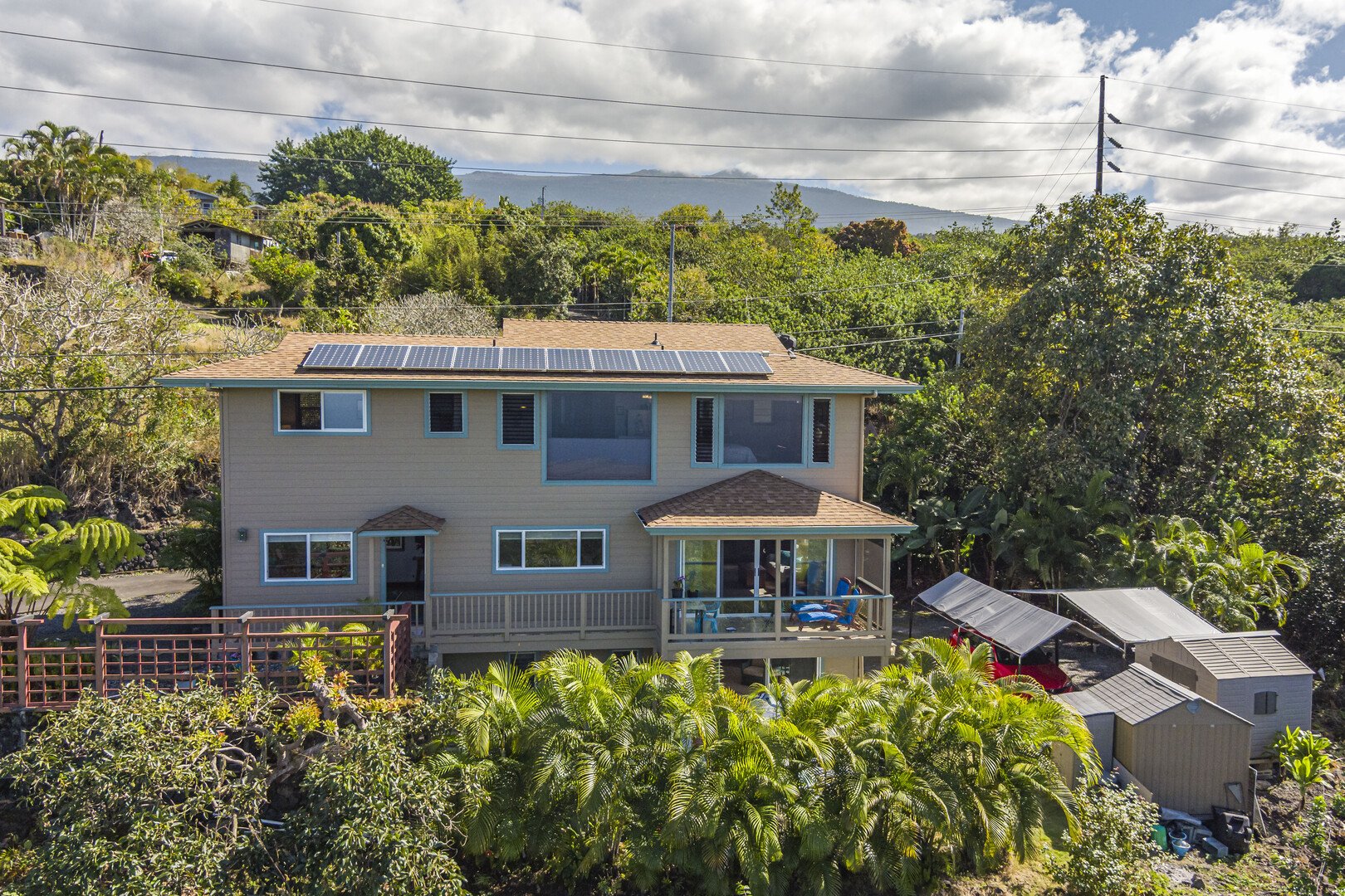 Great opportunity to own in the desirable area of Holualoa with fantastic ocean views! Lots of living area on a smaller lot with less maintenance, yet surrounded by undeveloped acreage making it very private. This home has been immaculately maintained and has 3 stories. Entrance to the main level has easy access with no stairs. Features an open plan kitchen with hardwood cabinets, quartz counter tops and an oversized pantry. Comfortable dining room and large living room lead out to covered lanai overlooking the Kona coast. Also on this level is a half bath. Going upstairs from the main level, to the 3rd story, is a spacious primary bedroom with panoramic ocean views, large walk in closet and oversized primary bathroom where you can enjoy ocean views from your soaking tub! Also shower and double sinks. Upstairs also has an office with ensuite full bathroom currently being used as a third bedroom. From the main level going downstairs are the spacious guest quarters with separate entrance, kitchenette, full bathroom and covered lanai off the living room area. Driveway continues to the back of the house with ample parking. 10 photovoltaic panels on net metering with 2 solar water heater panels help with keeping electric bills low. New roof installed 6 months ago. Exterior of home painted less than a year ago. Location is minutes from Kona town, shopping, restaurants and beaches. COME LIVE THE HAWAII DREAM!!