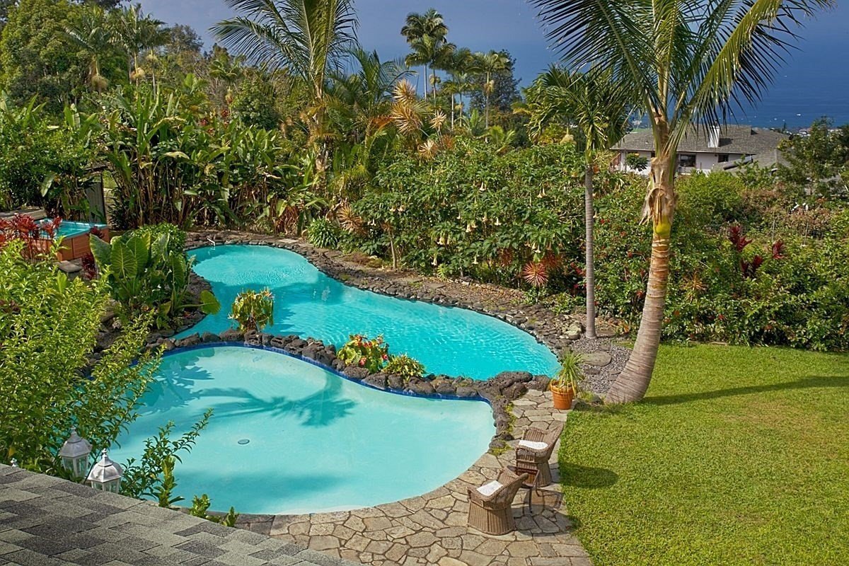 You MUST SEE this Holualoa piece of Heaven. Rare opportunity to own your own piece of paradise situated on 5 acres in Keopu Mauka. Enjoy breathtaking ocean coastline views from your home nestled on the slopes of Hualalai on the Big Island of Hawaii. Over 3123 sq ft under roof of main dwelling, expansive 5 or 6 bedrooms,(6th bedroom could be office with a view!) 3 bath, wraparound lanai and separate huge utility room. Property features TWO swimming pools (adult pool and a kiddie pool) with 3 waterfalls & a hot tub. Also features a 550 sq ft attached cottage for additional guest quarters with another hot tub. Main house has a Lapohepohe fireplace, on north end of main floor there are 2 bedrooms and a full bath plus another room for office or bedroom. There's a large pantry and utility room with sink. The south side of main floor holds the large kitchen, living room, dining room and space with a pool table that stays with home. Upstairs is a huge master suite on north end and 2 more bedrooms with jack and jill bathroom on south end. The end bedrooms both have lanais facing the expansive ocean view. There is a wrap around covered lanai on 3 sides of the home for outdoor living. New solar hot water tank with propane Palmona instant heat back up. When you drive in the stamped concrete circular drive surrounded by fenced pastures you know you have arrived. The house sits far off the road for complete privacy. There is an 800 sq ft detached garage + more space. You will never want to leave this very secluded, peaceful and true paradise estate. The grounds have plentiful apple banana, star fruit, fig, star apple, sour sop, lilikoi, lychee, lemon, tangerine, orange, avocado trees plus pineapple and a vast abundance of botanical wonders, hibiscus, bromelaid, croton, palms, coconut, anthurium, orchids, ti and many varieties of coconut and palms The house is occupied, please no drive-in lookers without appointment. Owner is a real estate agent in WA and