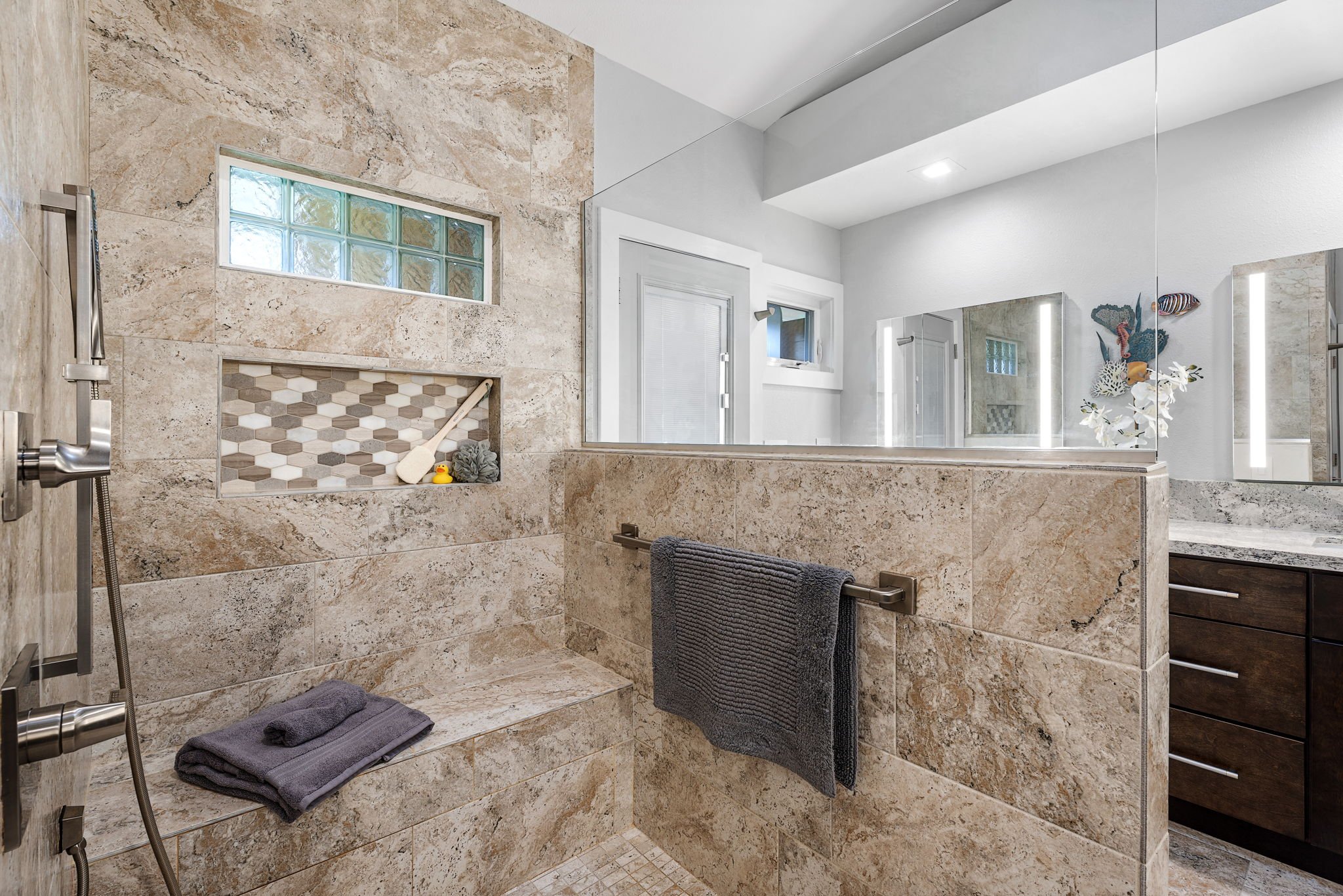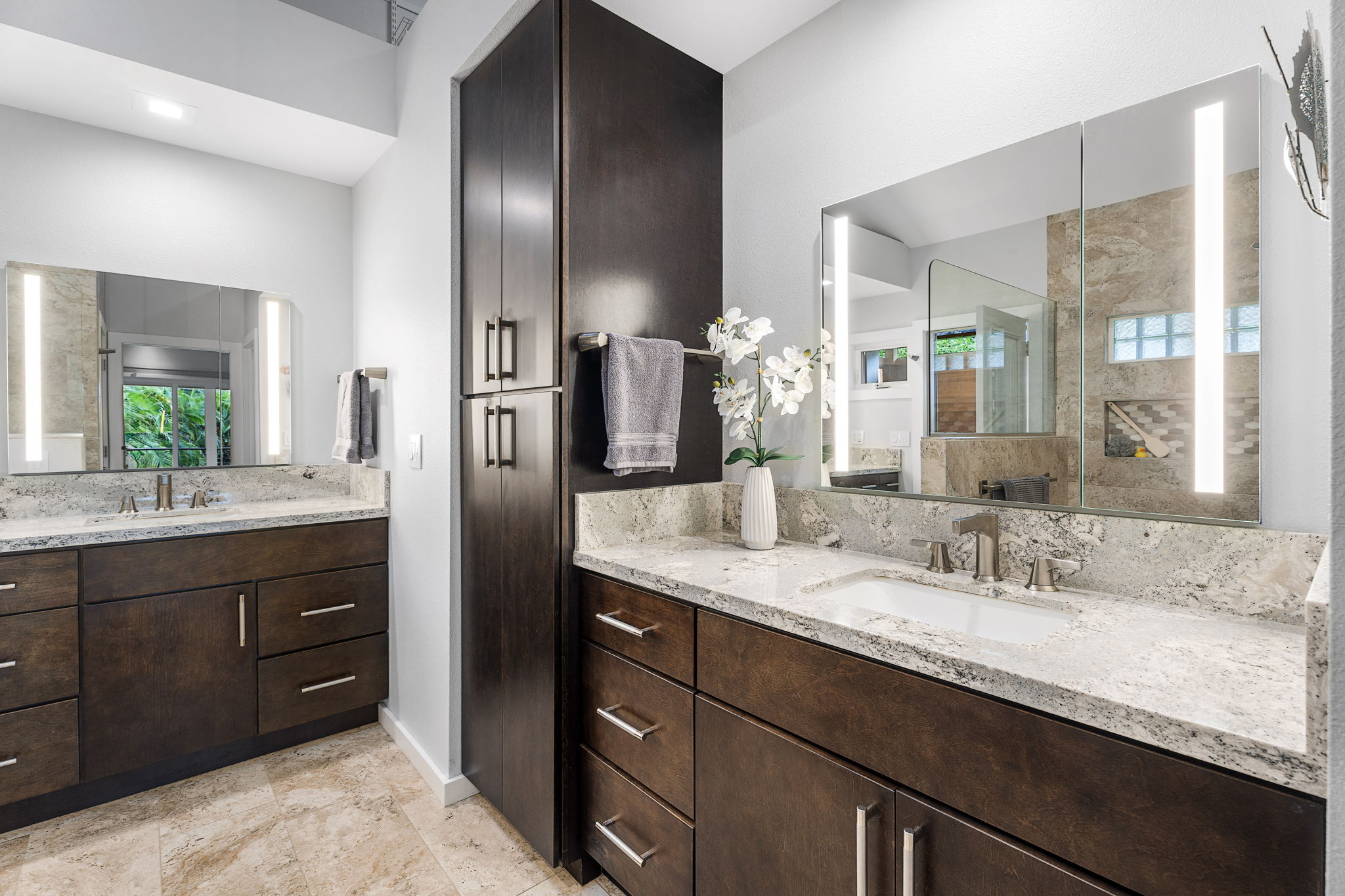 The primary suite opens directly to the lanai and includes a remarkable walk-in closet. The spa-style bath offers a curbless walk-in shower with dual controls and seating, dual vanities with lighted medicine cabinets, sun tunnels, and access to a private outdoor shower. Two additional guest bedrooms—one currently an office—plus a well-placed main bath complete the thoughtful floor plan. Furnished Home! exclusion: Primary bedroom furniture Office furniture Artwork