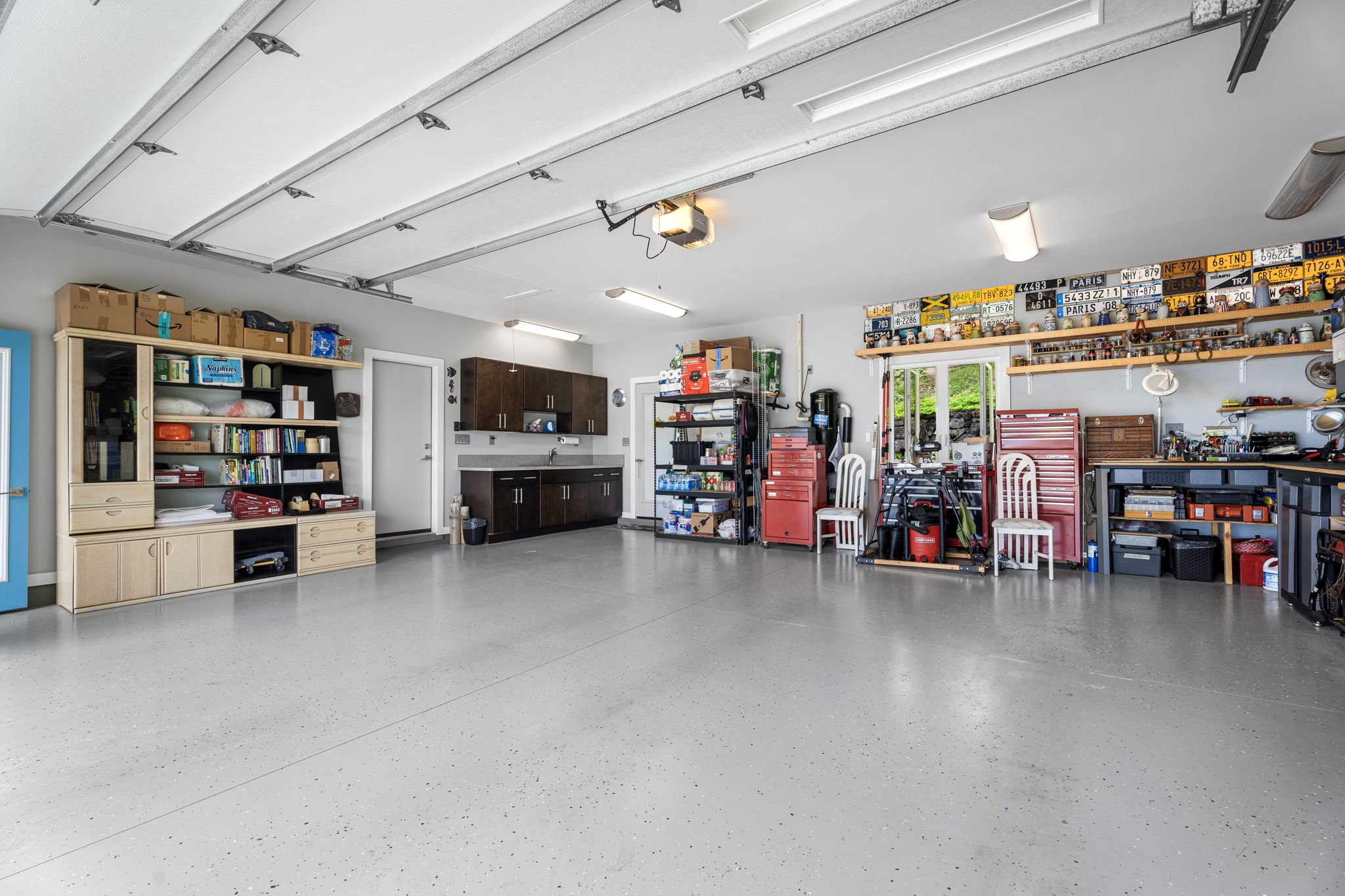 The chef’s kitchen is a dream, with a large L-shaped island, quartz counters, solid wood cabinetry, and top-grade appliances including a Sub-Zero refrigerator. The adjacent pantry/laundry room provides rollout drawers, a sink, and an Electrolux washer and dryer.