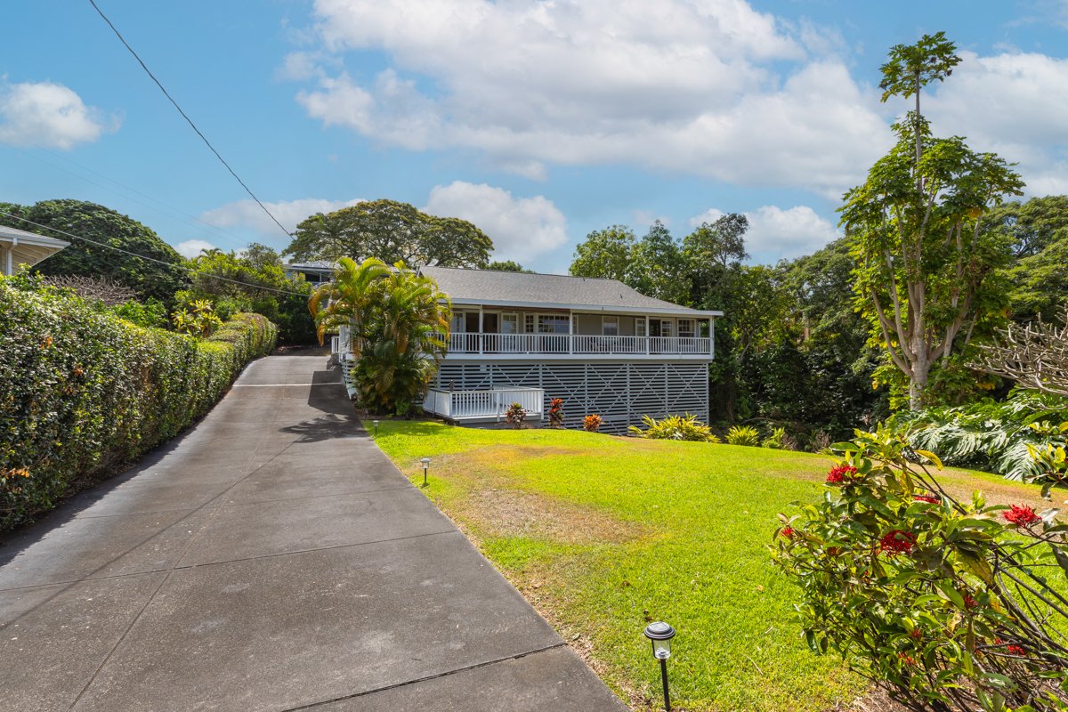 Charming Plantation-Style Home in a Prime Kona Location. This well maintained plantation-style home offers 1,872 sq. ft. of single-level living, featuring three bedrooms, two baths, and nearly 400 sq. ft. of lanai space designed for seamless indoor-outdoor living. French doors invite refreshing breezes, while the spacious kitchen boasts ample storage, a corner pantry, and classic oak cabinetry. Refinished solid wood floors add warmth and character to the kitchen and main traffic areas. The expansive primary suite provides a private retreat, while the full-length lanai offers an ideal space for entertaining or quiet relaxation. Recent upgrades include a brand-new roof and gutters, termite tenting, fresh paint, new facets, new disposal, new carpet, and refinished floors. With potential for expansion below, this property presents an opportunity for additional income or a private guest suite. Situated on over one-third of an acre in a peaceful cul-de-sac, this desirable neighborhood features a community center, tennis courts, and pickleball courts. Conveniently located just five minutes from Kona town, beaches, and essential amenities, this home offers the perfect blend of comfort, convenience, and island charm.