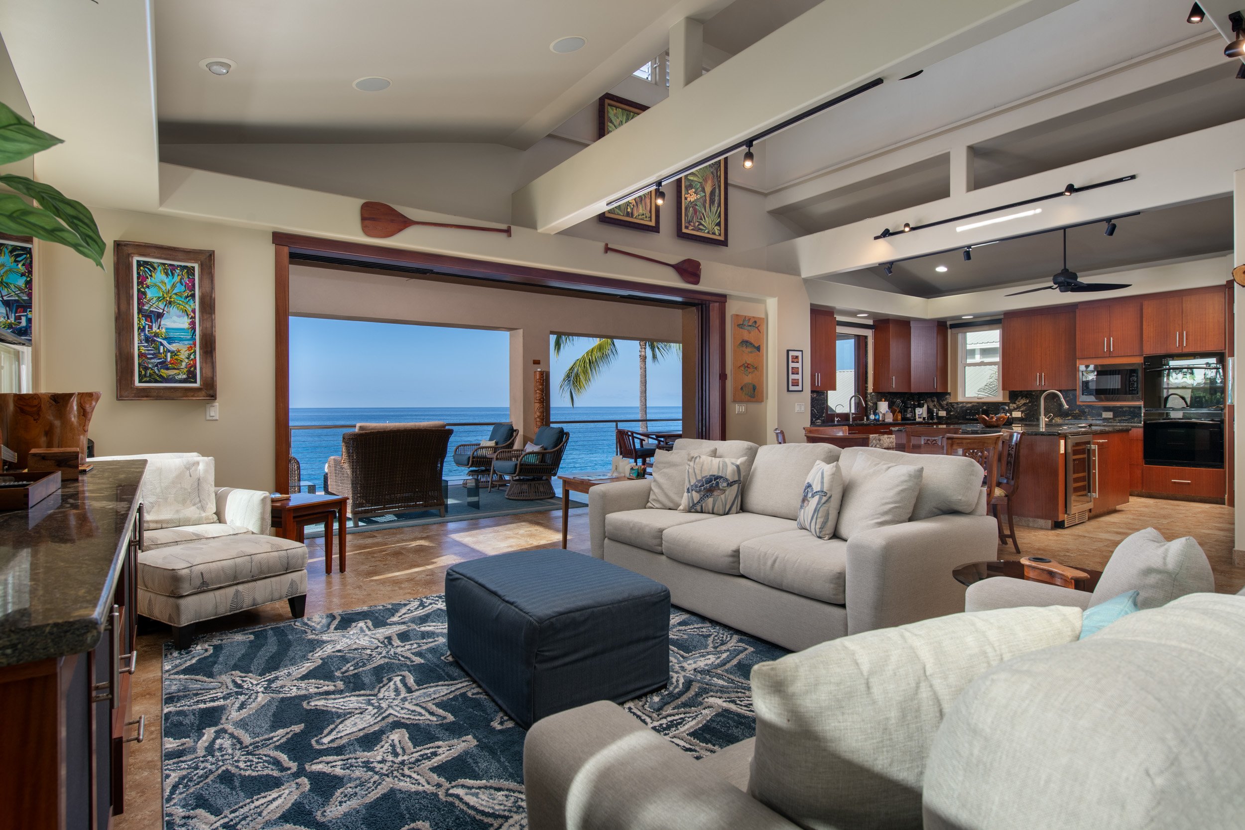 75-5952 Ali'i Dr is an exceptional oceanfront residence in Kailua-Kona. Built in 2011, the residence is designed for effortless indoor–outdoor living! Expansive covered lanais extend the living spaces and capture year-round ocean activity, from whales and dolphins to paddlers and Ironman athletes.This oceanfront property offers exceptional convenience and an unparalleled coastal lifestyle. Your private on-site elevator gives you all of the convenience you could hope for.The main living area serves as a spacious great room with vaulted ceilings, louvered windows for natural breezes, and sliding pocket doors that open fully to the lanai. The kitchen includes custom mahogany cabinetry, high-end appliances, a large island with prep sink, and a pass-through window ideal for entertaining. An office with built-in desk and a powder room complete this level.All bedrooms are located on the second floor for added privacy. The primary suite features an oceanfront lanai, dual-vanity bath, walk-in shower with dual heads, and a generous closet.22 owned photovoltaic panels, additional features include an outdoor shower, full laundry room, private putting green, outdoor hot tub, elevator, central vacuum, split-zone AC, stainless steel railings, and solar water heater. With approximately 2,277 sq ft of lanais and carport areas, the home is offered turnkey and operates as a permitted short-term vacation rental, with resort zoning.