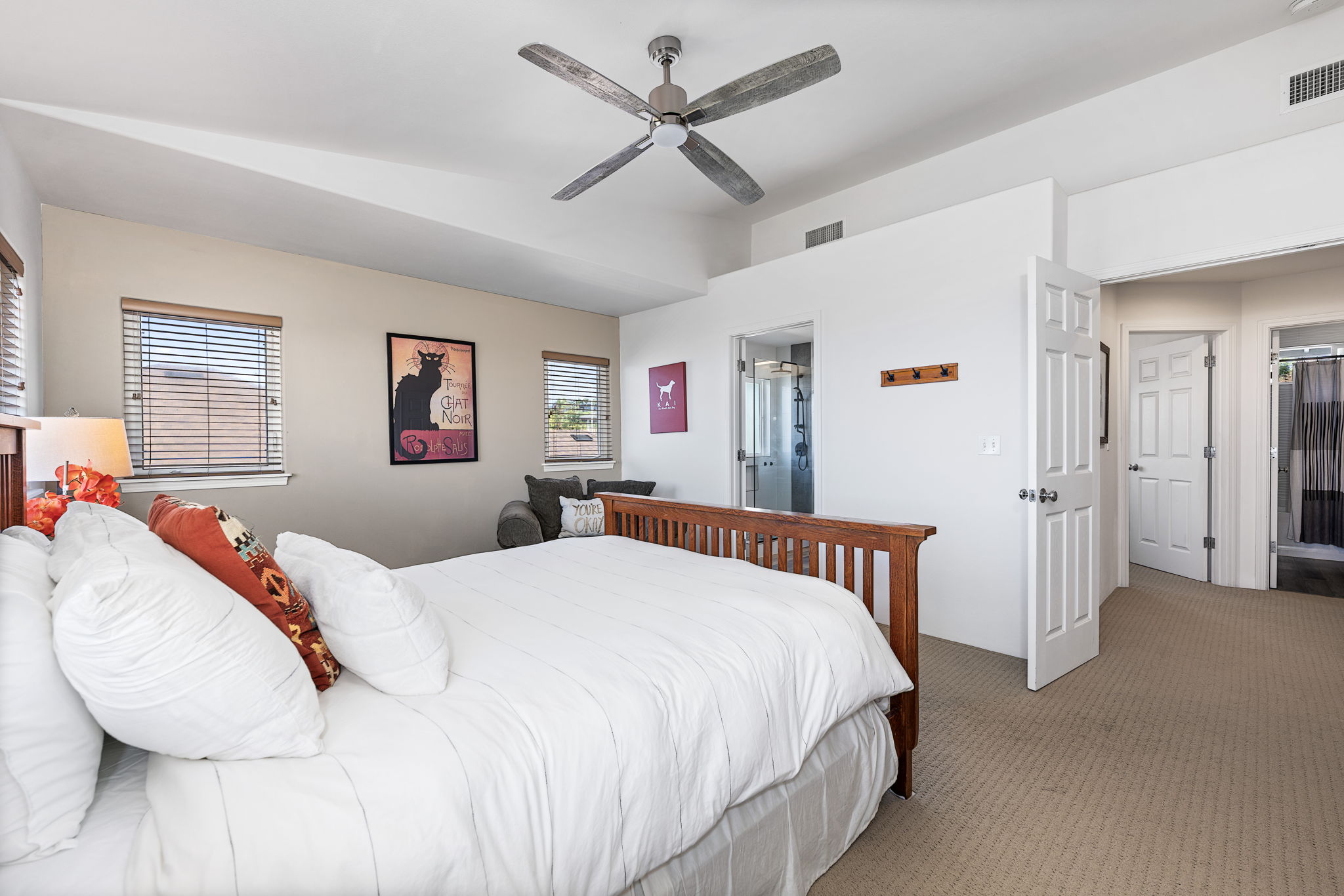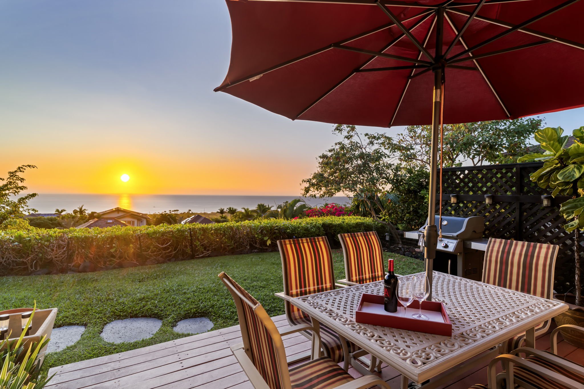 Home is where your heart is and this home will truly capture yours! This is the one of the best properties in Pualani Estates, on the upper quadrant of the subdivision, and one of only a chosen few Hibiscus models in the neighborhood! This home, positioned on the corner of a double cul-de-sac, was wrapped half in stucco and half with wood, giving it a very handsome exterior finish. Inside has a huge open living area that connects the kitchen and flows out to the covered and open lanais, which were extended by decking made of a durable man-made type of material, to resist the elements. Extensive rock walls were added to the west side of the property to create a larger more usable pet friendly back yard. And the panoramic ocean and sunset views from this property, perched high on the hill, are incredible!! Landscape lighting after dusk transforms the yard into enchanted gardens and sets the mood for peaceful evenings.The spacious, tastefully renovated and modernized kitchen is complete with stainless appliances, sprawling counters, an abundance of cupboards, a corner pantry, center island with bar seating, and a powder room.Upstairs you will enjoy four private sleeping quarters and 2 bathrooms. Two of the rooms have lovely island coastline and sunset views, while the other two rooms enjoy up-slope mountain vistas. The primary bedroom is ensuite, with a fully renovated bathroom, separate water closet, walk-in clothes closet and coastline ocean views. Two rooms are set up as guest rooms, one with ocean and the other mountain views, and the 4th is presently being used as a home office. The home has lots of windows allowing for natural light and great cross ventilation, but also central a/c, as well as a leased Photo-voltaic System. Pualani Estates enjoys underground utilities with streetlights, sidewalks, and a community playground complete with baseball and soccer fields.