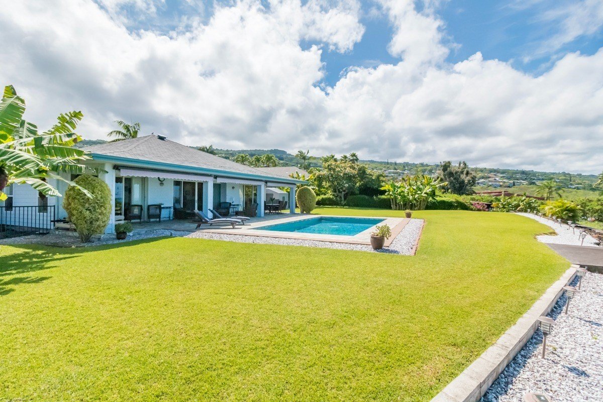 The large covered lanai area accessible from the Living Room is perfect for relaxing / entertaining and enjoying the spectacular Kona sunsets. A large in ground swimming pool and deck area complete your private island getaway.