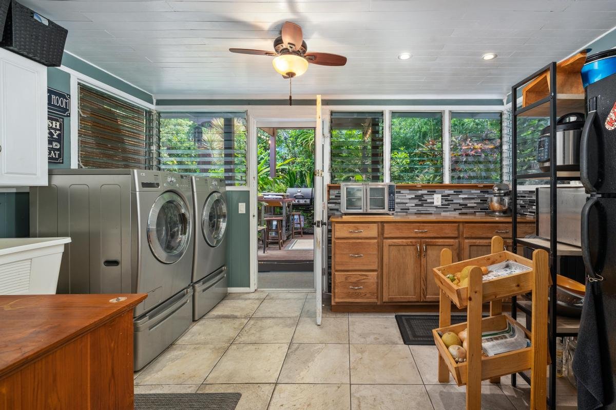 Convenient location with Ocean Views, this thoughtfully laid out house has three bedrooms and two full baths in the main living area. The main great room has ocean and sunset views and is large and comfortable. This room flows into the dining area and on to the well designed kitchen which will make any chef happy. Off the kitchen is a large Pantry/utility room with washer and dryer cupboards and lots of room for produce. Out the back is a simply wonderful outdoor kitchen & separate Tiki Bar! This thoughtfully designed space is ideal for entertaining outside under the expansive covered lanai extending across the back width of the home. Abundant teak tables and chairs provide seating that opens to lush tropical fruit and flower gardens that flow out to the back of the lot.