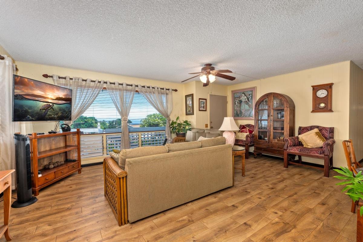 Wake up to enjoying breathtaking views of the Pacific from your lanai, where sunsets paint the sky in shades of red, pink and gold! A unique Island style home with Views, comfort, in this lovingly cared for home, sold furnished with mostly all teak furniture!