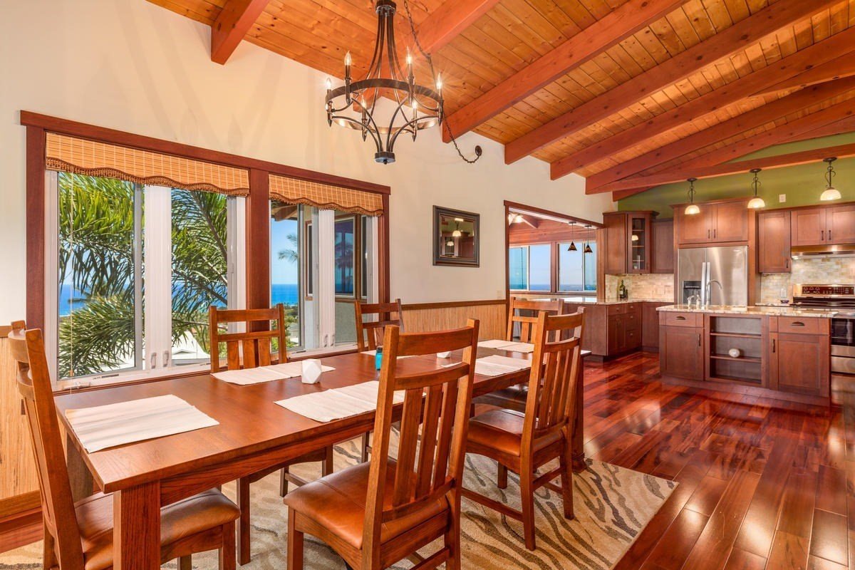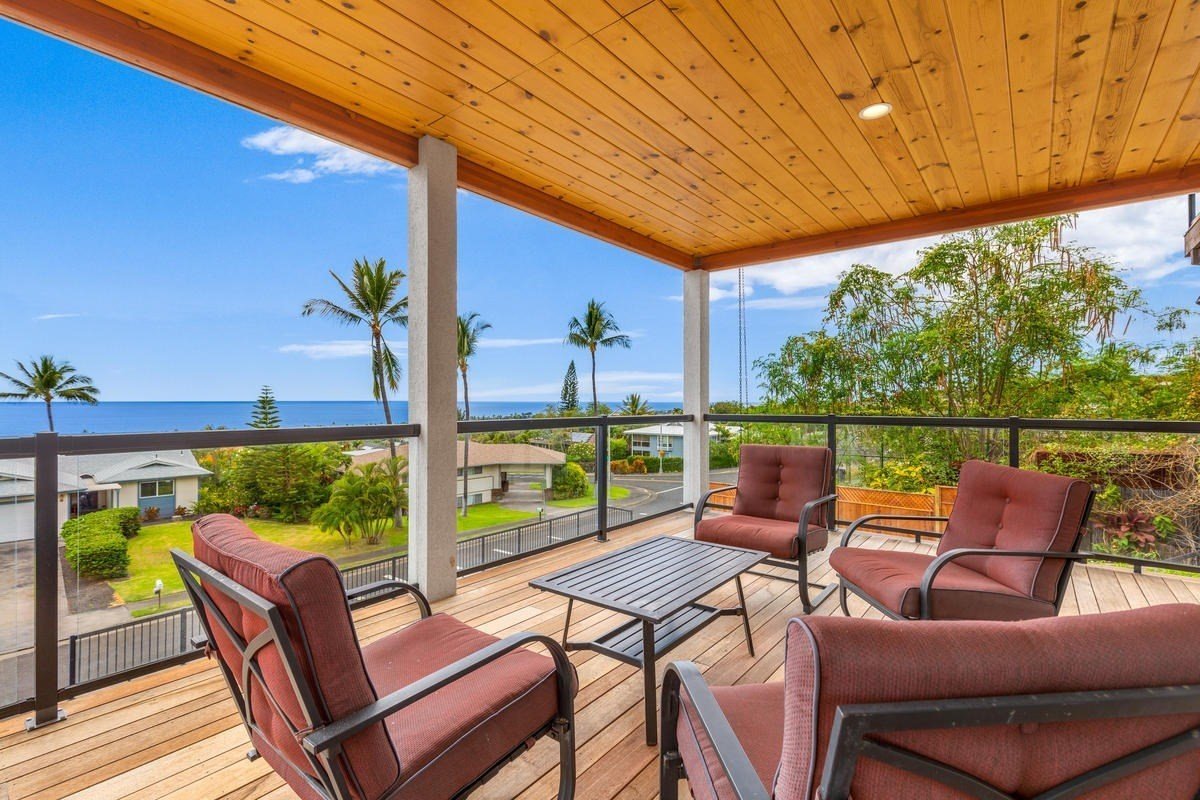 This elegant, two-story home in one of North Kona’s premier neighborhoods offers panoramic ocean and coastline views from both levels. Perfectly situated in Komohana Kai – approximately mid-way between Kailua-Kona and the community of Keauhou – the location is both convenient and private with the generous sized lots found here. Beaches, golf courses, shops, restaurants and all necessary services are just a short drive away. The top floor’s great room features an open-concept kitchen, dining and living room that enjoy cool breezes from the large windows surrounding the enclosed lanai. Vaulted, open-beam, tongue and groove ceilings include a skylight providing even more natural light in the living room, providing a bright, tropical vibe. Brazilian Cherry wood flooring is found throughout the living areas and bedrooms on this upper floor. Large granite counter tops, stainless steel appliances and abundant cabinets are showcased in the kitchen with its open view through the great room to the spectacular Kona coastline beyond. The spacious master suite looks out over Kailua Bay with a large sliding door opening to the lanai that runs the entire length of the home’s north side. A guest bedroom, guest bath and large laundry room with plenty of storage space completes the second story floor plan. First floor highlights include a separate entrance, living area, bedroom and combined bath/laundry room. The living room opens to a large covered lanai with beautiful ocean views. This downstairs space is perfect for a blissfully private guest bedroom.The well-designed driveway provides extra off-street parking space on the lower level and wraps around and up to the back of the home for easy, level entry into the second story. The grassy, nicely landscaped backyard has ample space for a pool. Rock walls surround the property, creating a safe and secure outdoor play area for children and pets. Photo voltaic solar net metering. Seller owned solar panels not leased.
