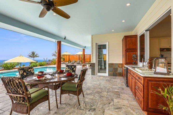 The interior of the home is beautiful, but step out the pocket sliders to the huge lanai with approximately 1400 sqft under roof and you have a second living space. The lanai has beautifully stained Ohia Posts, a wet bar with custom cabinets, granite counters and icemaker. Perfect for entertaining or just sitting back and enjoying the view and the salt water pool. The pool has a tanning shelf and fountain plus outdoor shower.