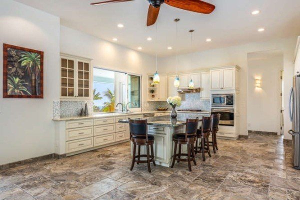 The Kitchen is any cooks dream...Complete with custom soft close solid wood cabinets and beautiful granite with an island big enough to accommodate a family for dinner. The kitchen has a pass through window to the lanai wet bar area, stainless steel appliances with propane stove. The soaring vaulted ceilings and 8 ft doors throughout add to the openness of the home. Throughout the main living area and kitchen you will find Silver Travertine in a Versailles Pattern.