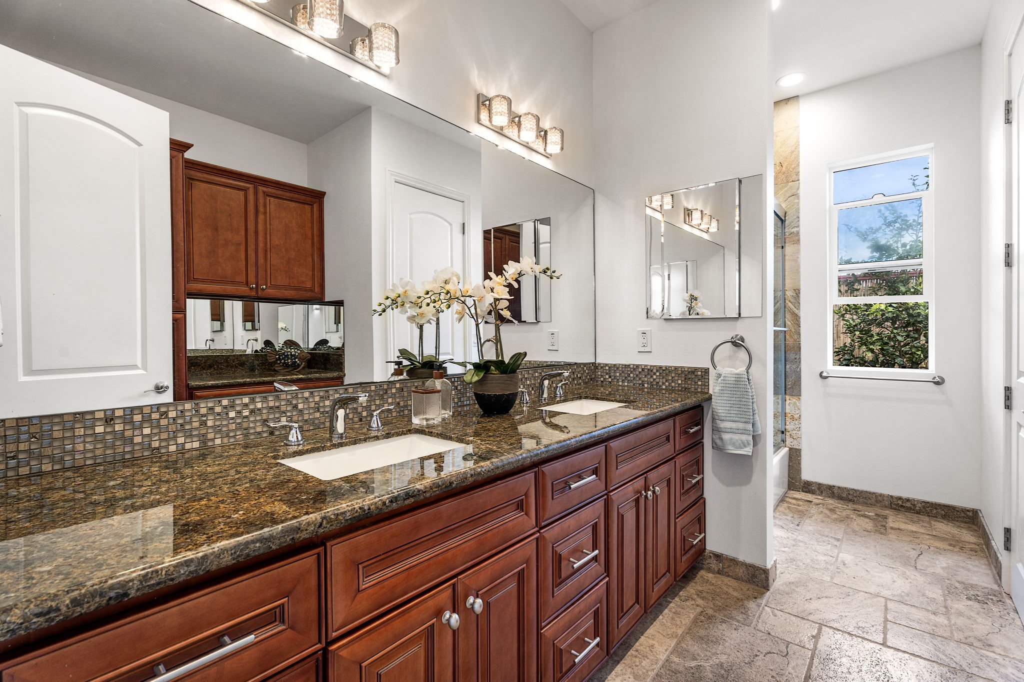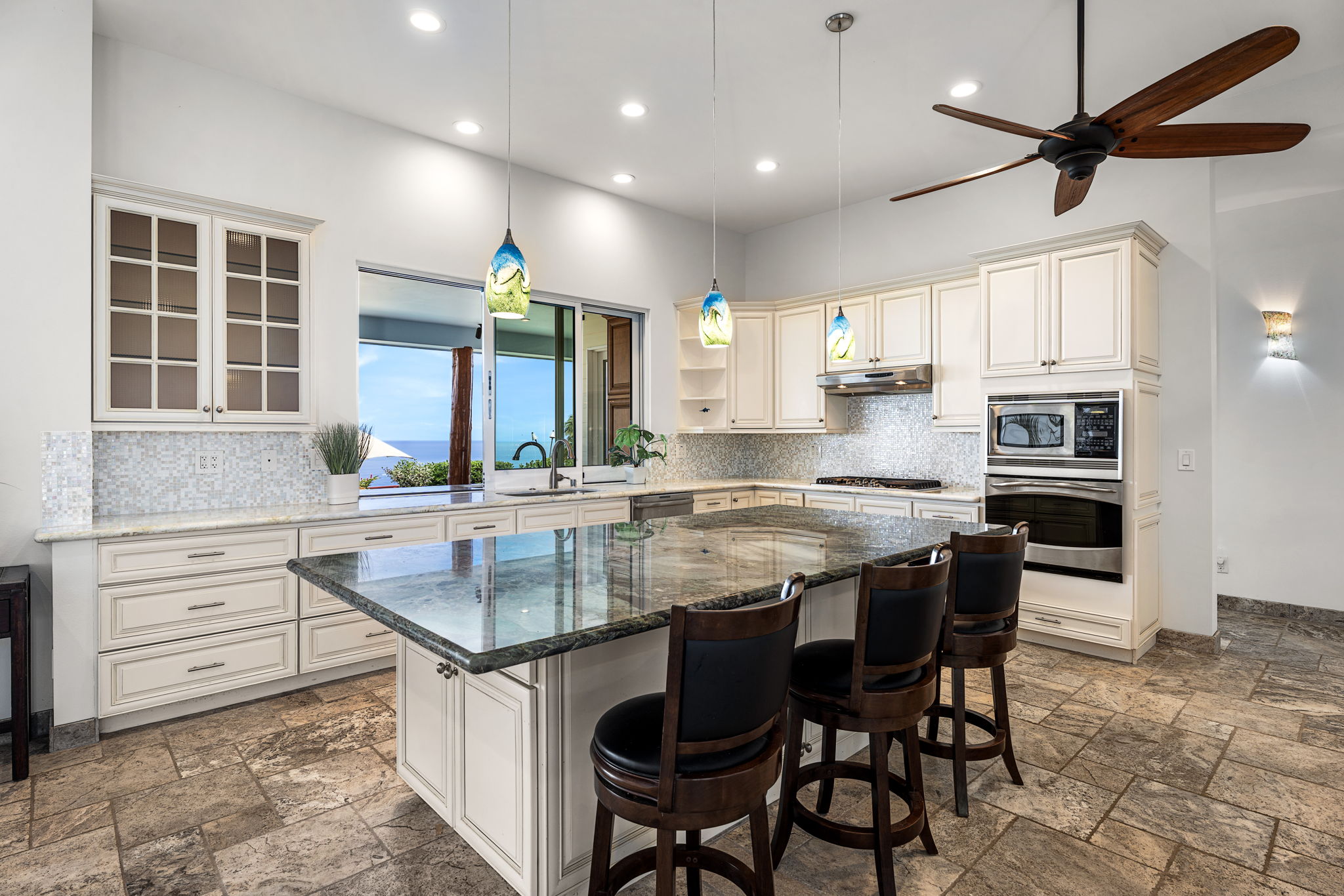 The chef’s kitchen and spacious living areas flow seamlessly to the outdoors, emphasizing the home’s island lifestyle. There are so many cabinets plus a large pantry with many more cabinets, laundry and dog bath.