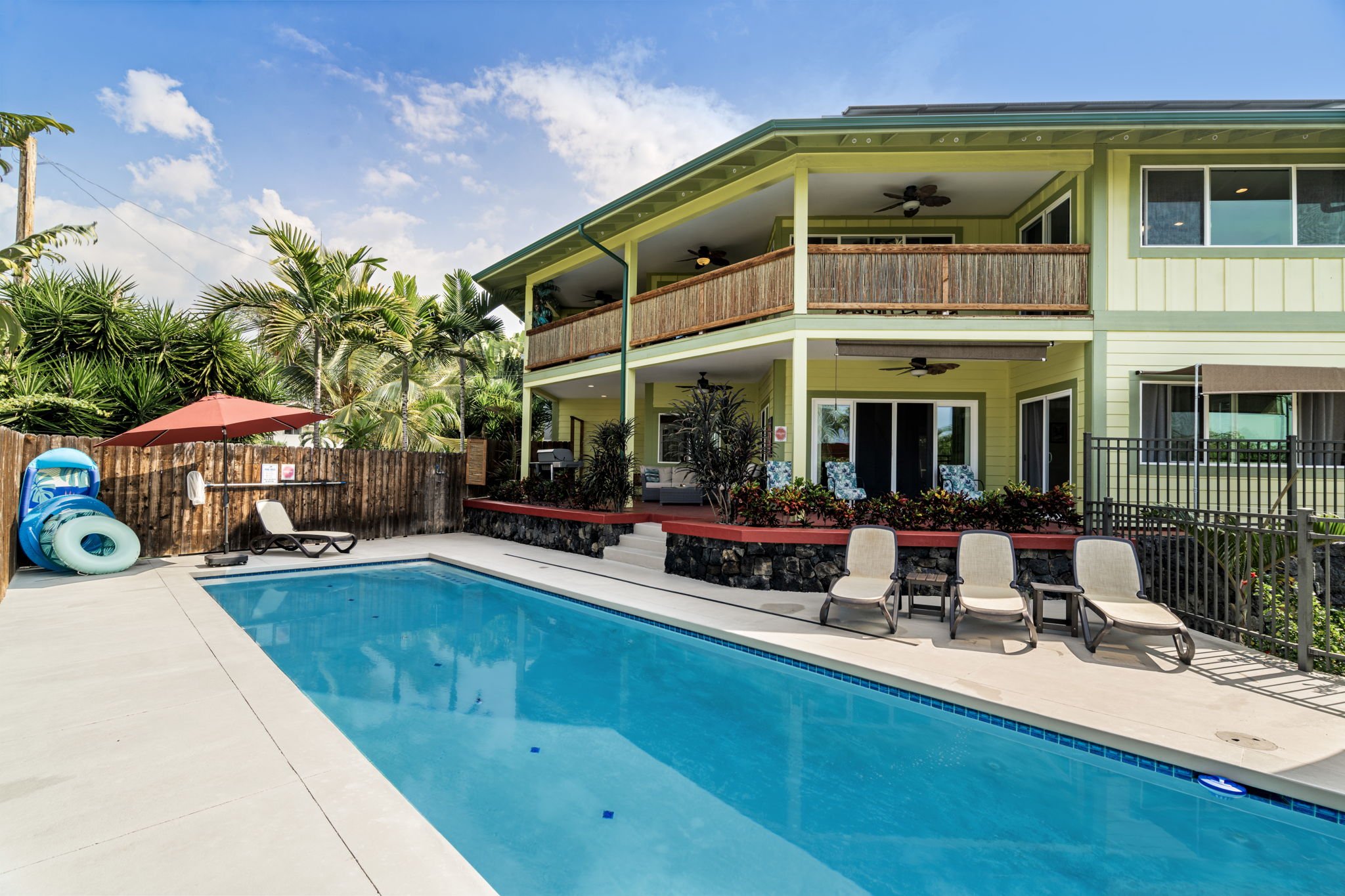The outdoor space is a true paradise, complete with a sparkling pool, perfect for relaxing or enjoying a refreshing swim. The lush, tropical surroundings enhance the home's tranquil vibe. The perfect sized yard below the pool allow recreation for those who would rather enjoy an outdoor game instead of swim.