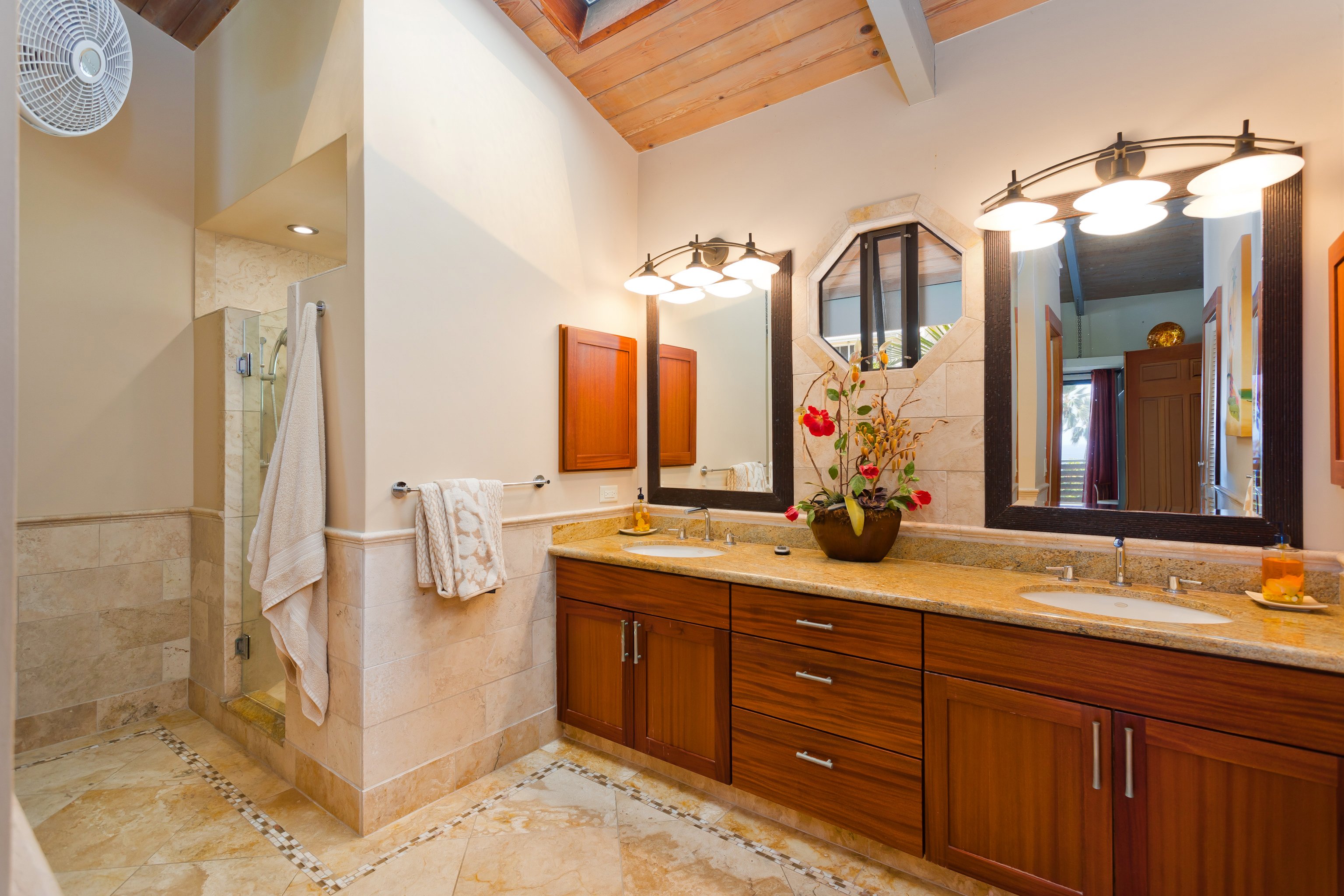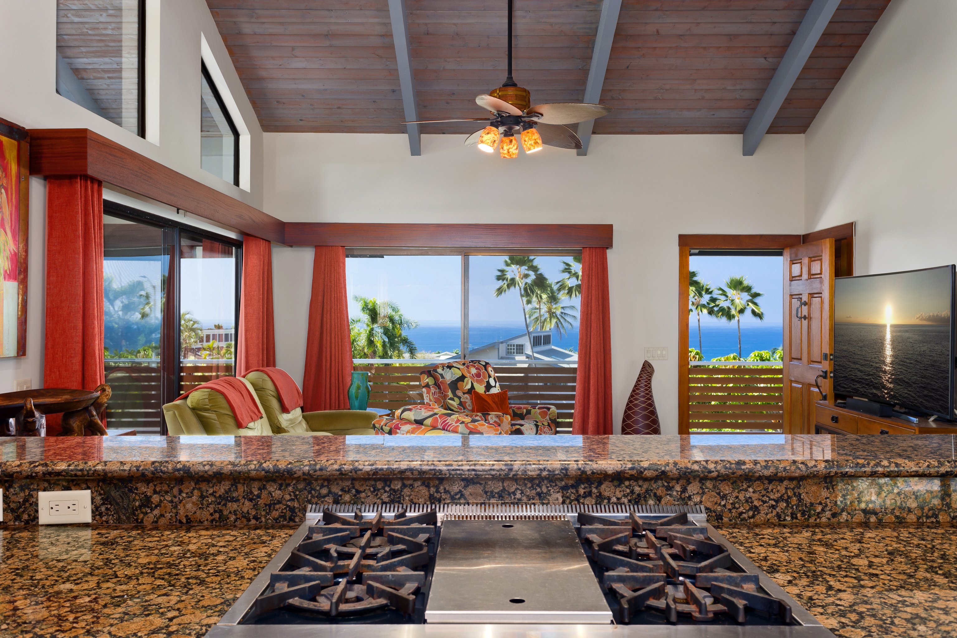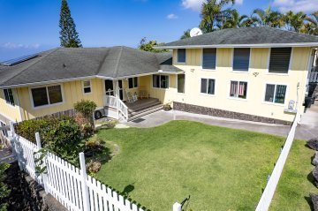 Welcome to this impressive and updated 2 story 4 bedroom 3 bath home located in a well established neighborhood & blessed with two separate living areas that graces a large corner lot, fringed on three sides with privacy trees & hedges. Located at a comfortable elevation of approximately 250', this enviable home overlooks a well tended landscape of lawn & attractive low profile west boundary hedge to an inspiring view of the ocean. This home is energy efficient & comes with an owned & net metered photovoltaic system together with two solar hot water systems with 120*2 gallon reservoirs respectively. Other notable features include:-Upper level:- * 3bd/2ba with 1400 sqft of living area & a wraparound covered lanai of 968 sqft. * Resplendent tiger wood flooring in the kitchen & dining area together with eye-catching black slate living room flooring. * Travertine tiled bathroom floors & showers. * High open beam T&G cedar ceilings. * Mahogany kitchen cabinetry & paneling. * Top of the line kitchen appliances. * Attractive granite kitchen counters & bathroom vanities. * Large entertainment area encompassing the southern end of the covered lanai. Complete with BBQ grill, granite counter space, refrigerator & sink.Ground Floor:- * A living area of 672 sqft that includes a bedroom, bathroom, living room & wet bar. * A three vehicle garage. * A laundry complete with storage cabinets, counter & sink.Landscape Features:- * Northern, eastern & a portion of the southern boundaries defined by high hedges. * Rockwall along a portion of the north east corner. * A pergola & hot tub on a large cement pad near the north eastern corner of the property. * A producing mango tree.This property is located in well established Komohana Kai 2 subdivision & is approximately 4 miles south of Kailua-Kona & a similar distance north of Keauhou Shopping Center. Video: https://player.vimeo.com/video/1156397614