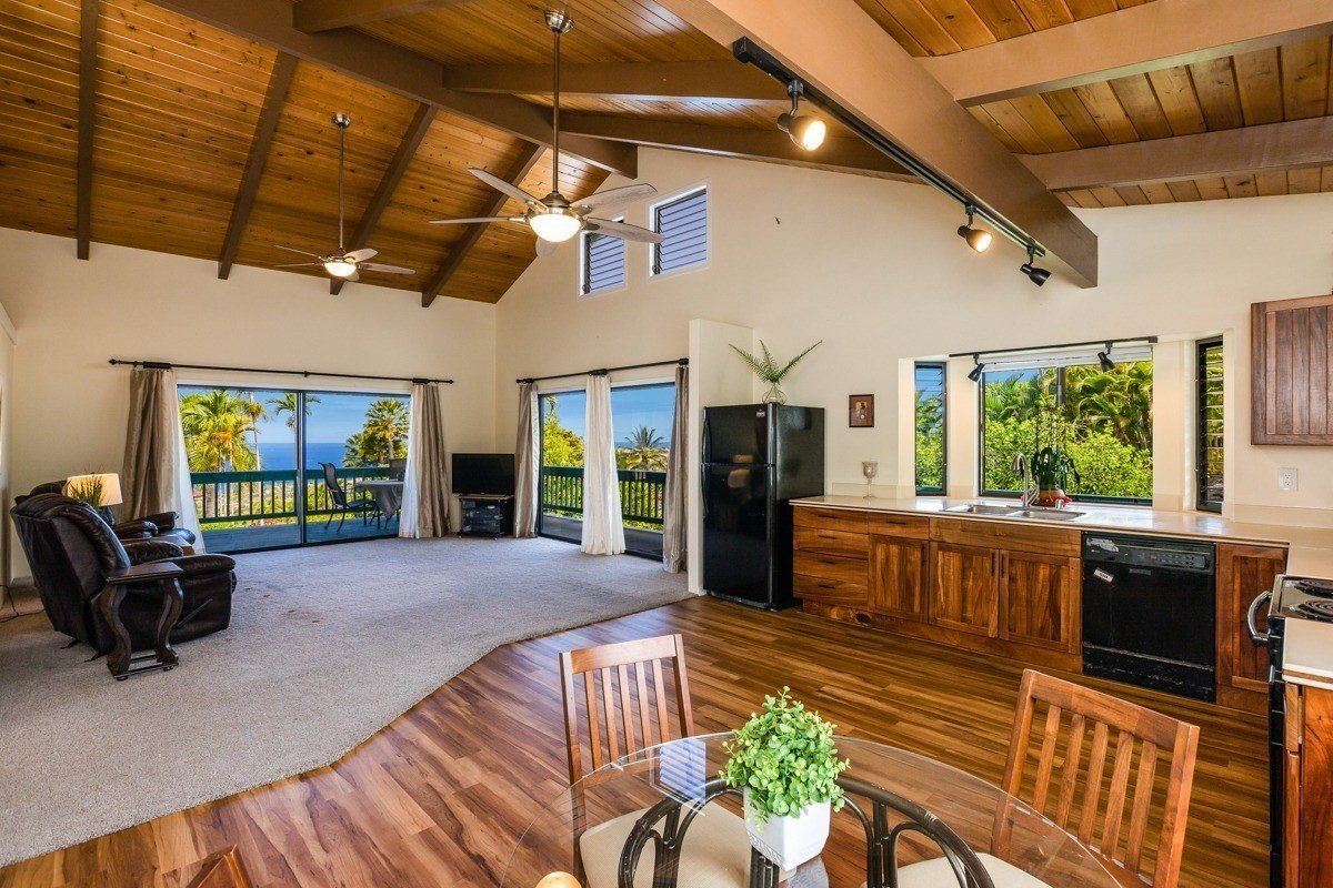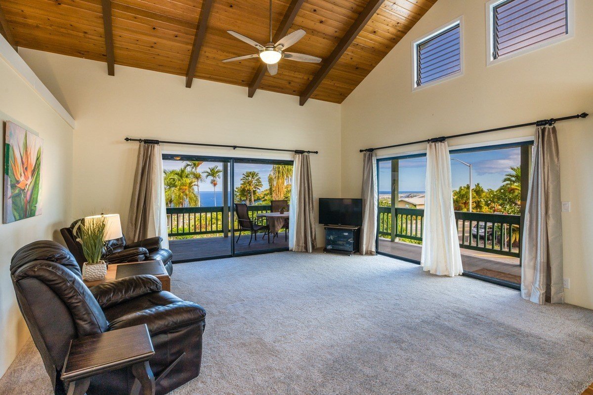 This large versatile home in Kalani Sunset is perched on the hillside above Kona and features a nice and coastal view. Located at a desirable elevation, this home has many custom features including stunning Koa wood kitchen and bath cabinetry, high vaulted ceilings and large lanais - perfect to enjoy the balmy weather and watch sunsets!