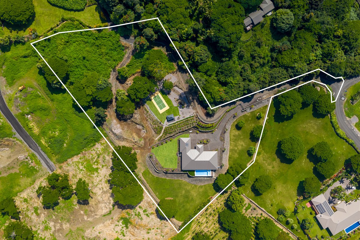 Perched above the Kona Coast in the exclusive Makalani Subdivision, this newly built custom estate offers panoramic, unobstructed views of the Kona Coast-perfect for whale watching, vivid sunsets, and front-row seats to fireworks on the 4th of July and NYE. Privately positioned on its own road, this home is the only residence on the street, ensuring unmatched seclusion and tranquility. Behind two private gates, this exceptional home spans 5,880 square feet under roof and showcases expert craftsmanship. Recreating this level of design, materials, and extensive site work today would come at a much higher cost, making it a truly rare offering. Extensive grading has been completed to create two additional pads, with their own gated entry-offering flexibility for future expansion, potential guest dwellings, or agricultural use.Designed for both luxury and functionality, the home features four en suite bedrooms-including two spacious primary suites- all with ocean views, independent AC, custom walk-in closets, and direct access to the expansive lanai. A flexible bonus room offers additional versatility. At the heart of the home, the open-concept kitchen and great room flow seamlessly to the covered lanai through 28-foot-wide NanaWall folding glass doors. The chef’s kitchen includes top-tier appliances from Sub-Zero, Wolf, Viking, and Cove, granite countertops, dual farm sinks, custom Sapele Mahogany cabinetry, and a custom wet bar with wine chiller and ice maker.Outside you’ll enjoy a 22-person spa that waterfalls into the pool below, outdoor shower, and oversized 3-car garage. A private upper-level recreation area includes a pickleball/basketball court, fire pit and shaded pavilion-all framed by stunning ocean vistas. With rich tropical finishes like Acacia wood floors, Paracas Travertine tile, and handcrafted hardwood surfaces of Mango, Ohia, Monkey Pod, and Koa, this one-of-a-kind estate captures the very best of resort-style living on Hawai‘i Island.