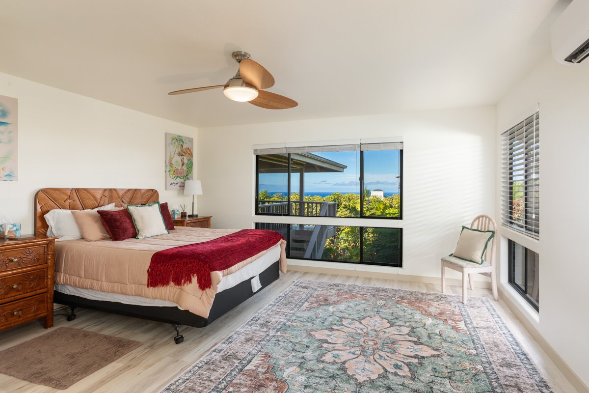Enter through a serene gated courtyard or from the 2 car garage to this beautiful home with amazing ocean views and additional rental or multi family units. 3 bedrooms and 2.5 baths upstairs all with split AC. Large Primary with a walk-in cedar closet. Luxury Plank flooring and newly painted walls with an ocean view on it's own side of the home makes this a special oasis. On the opposite side of the home, the other ocean view bedroom has had the floors replaced with the Luxury Plank flooring and freshly painted walls. The courtyard view bedroom as well as the rest of the upstairs has beautiful tile flooring including the extra large Lanai. Large laundry room, Living/dining room Kitchen with windows that open to the outside adds additional counter space. Downstairs are two separate large1 bedroom 1 bath units with luxury plank flooring. Each unit has it's own front door and split AC. large living room kitchen combinations and separate lanais. The South side unit has Corian countertops a large bedroom with walk in closet bathroom with a tub/shower combination and washer/dryer in the closet. The North unit has granite countertops in the kitchen, large bedroom and an additional room for storage. This bathroom has a walk in shower. There is a completely separate gated entry to these units with security cameras installed. The terraced backyard has been updated with new fencing and room for a pool should the new owner wish. Roof was updated approximately 2013 solar panels and solar water heater Fully Furnished.