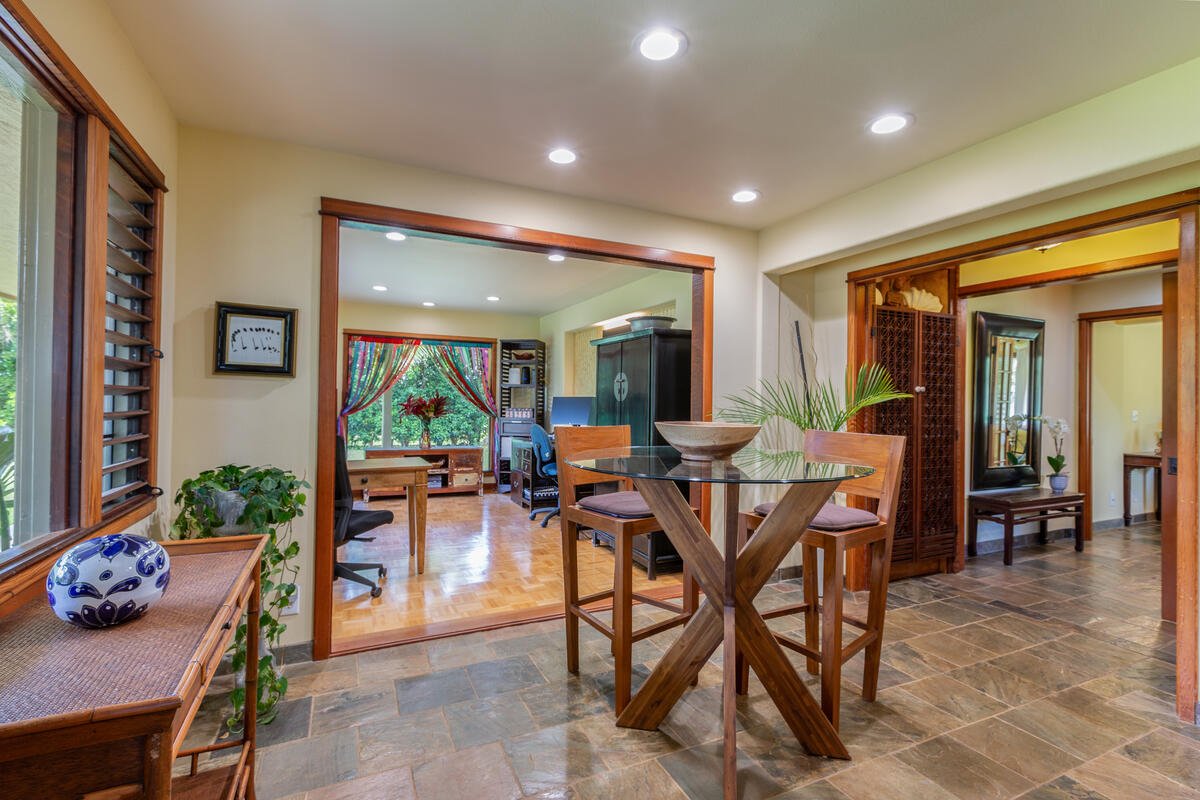 The primary living space for the home is located upstairs. Enjoy the mountain and distant ocean views as well as the glow of the sunrise and sunset from the many windows in the living room, kitchen, dining room, and primary bedroom w/ensuite. There are also 2 beautiful lanais that offer a great place to relax and take in the views as well as the island trade winds.