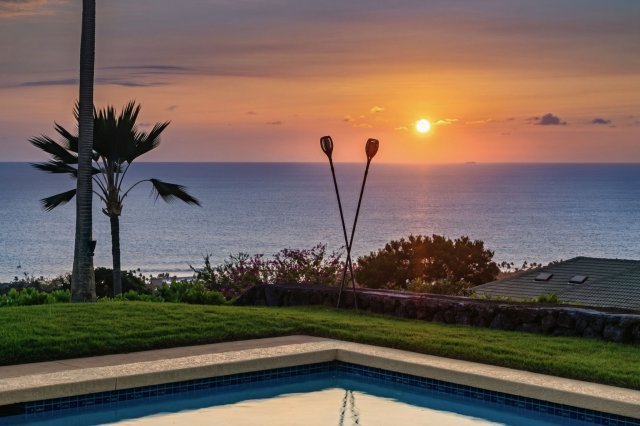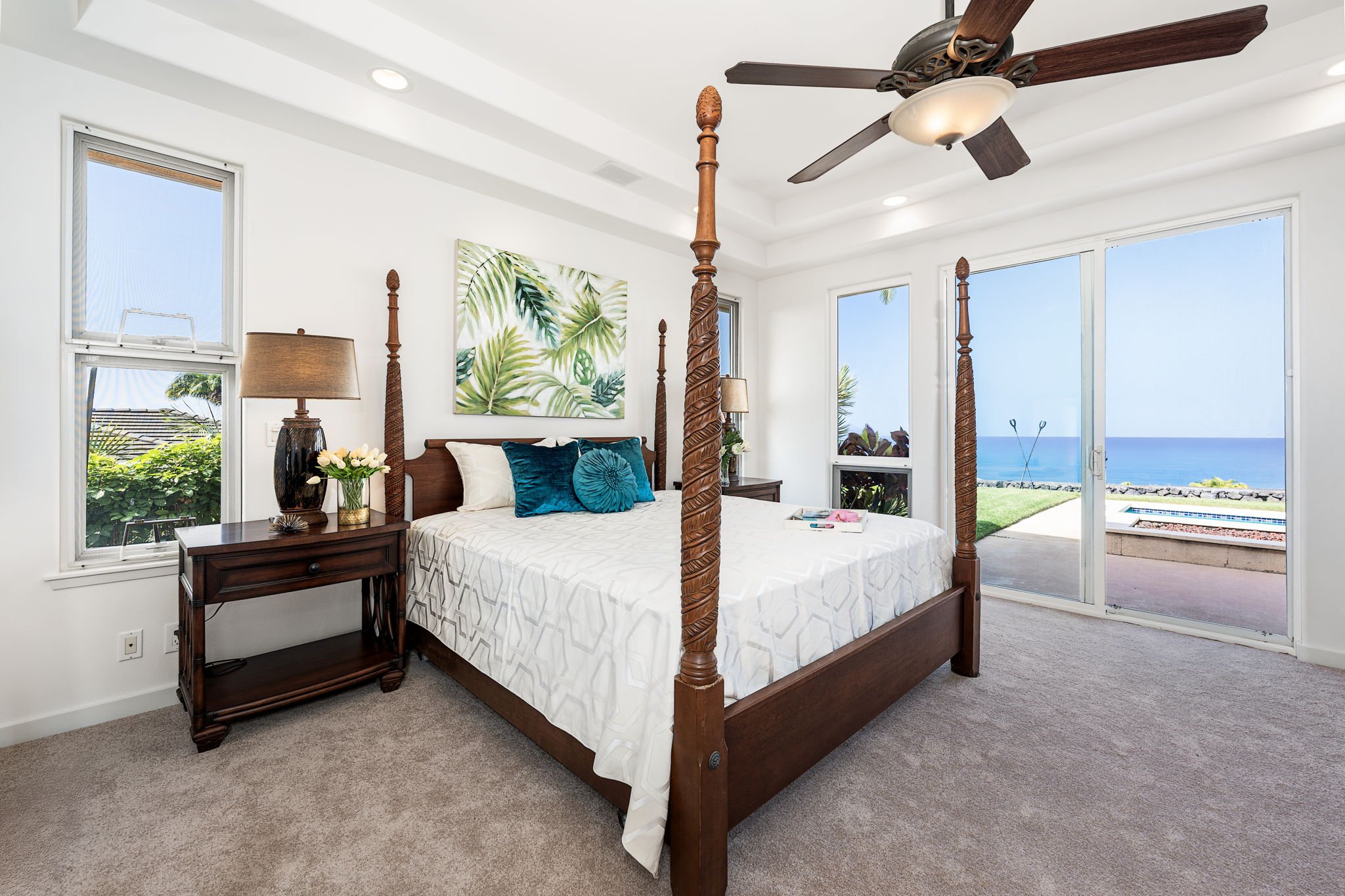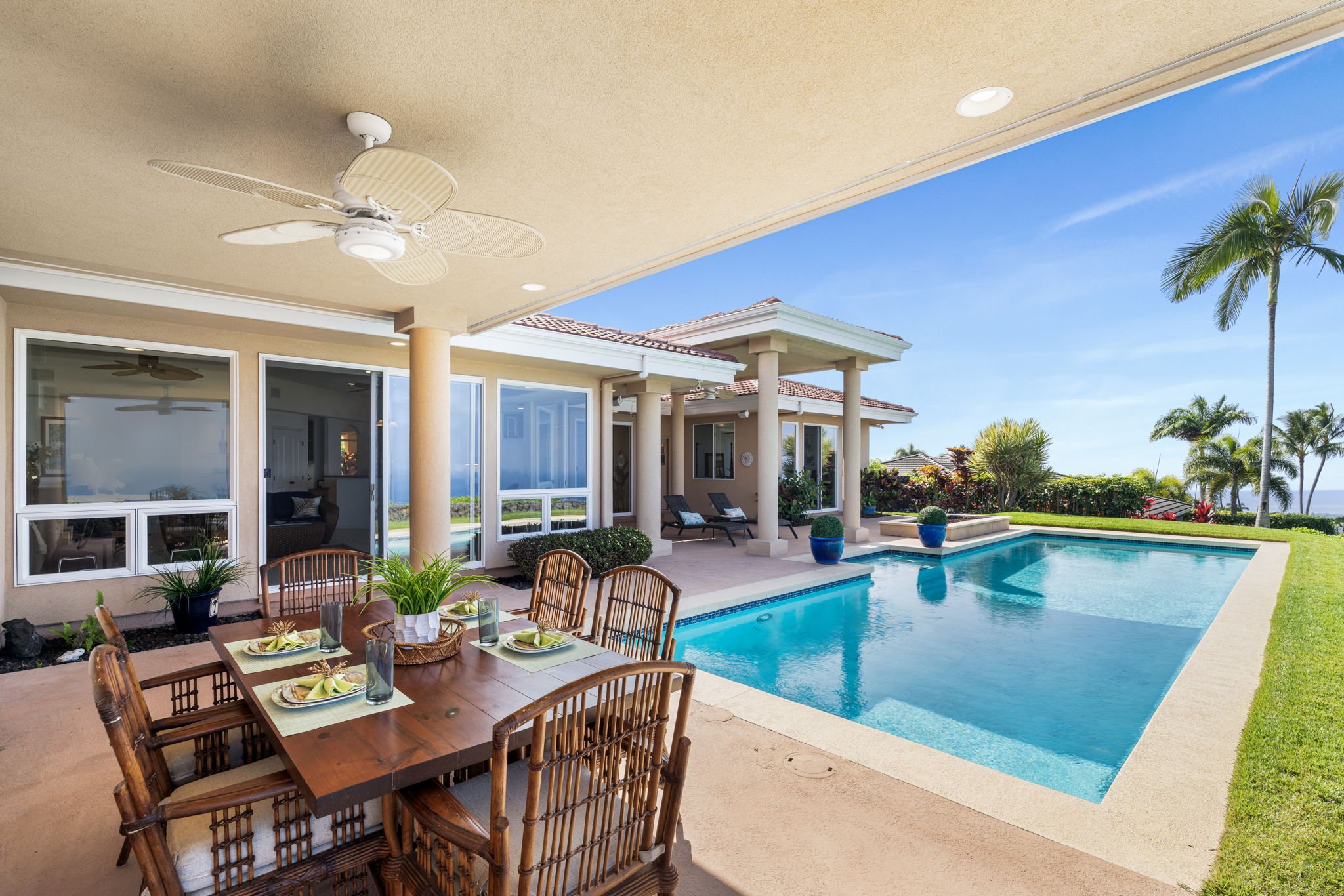 Spectacular Keauhou to Kailua Bay ocean and coastline views from this exceptionally private classically inspired residence, perfectly positioned at an ideal elevation within a gated community. This beautifully maintained home designed by Paul Bleck showcases timeless architectural character with soaring ceilings, dramatic pillars, graceful arches, and art niches. Single level no stair view homes are hard to find!A grand entry and formal dining room areas welcome you with breathtaking ocean vistas, while the spacious kitchen with granite countertops flows seamlessly into a spacious entertainment and family room—ideal for gatherings. Both spaces open to a covered lanai, pool area, and sweeping views for effortless indoor-outdoor living.The expansive primary suite offers tranquil pool and ocean views and a luxurious marble bath with oversized shower and jetted soaking tub plus huge walk in closet. Two additional bedrooms, main bath, powder room/pool bath and office area provide excellent flexibility.A long walk-in lap pool anchors the outdoor living space and is visible from all main rooms. A 270 sq. ft. architect-designed pool cabana enhances privacy and view enjoyment, complemented by easy-care tropical landscaping and mauka-makai breezes. Additional features include insulated double-pane windows, designed for excellent airflow, and full laundry room with easy access into the garage.Recent updates include fresh interior paint and brand-new carpeting. A pre-listing home inspection has been completed and is available for added peace of mind. Located just above the golf course and less than a mile from the desirable Keauhou area, close to beaches, shopping and dining. This is a rare opportunity to enjoy refined island living with unforgettable views.