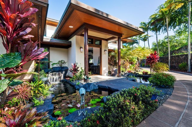 This exceptional two-story custom home offers furnished 4 bedrooms, 4 full and 2 half baths, plus a media room, across 3,857 sq. ft. of living space. Located at the very top of Bayview Estates at the end of a cul-de-sac, this residence offers a lot of privacy while capturing sweeping ocean, sunset, and coastline views. The upstairs primary suite is especially captivating, with a panoramic Kona Coast outlook and a private lanai for serene relaxation. Approaching the home is an experience in itself—you ascend a gently sloping driveway lined with graceful palms that guide you to the entrance. Floating steps across a tranquil koi pond welcome you inside, where a vaulted great room with soaring 17.5-ft ceilings, abundant natural light, and refreshing cross breezes set the tone. Brazilian Tigerwood flooring enhances the open floor plan, seamlessly connecting the living room and gourmet kitchen to an expansive lanai. Just beyond, an infinity-edge pool, spa, and built-in wet bar create the perfect space for entertaining with breathtaking views. Each bedroom is ensuite, offering comfort and privacy. The fourth bedroom, located above the garage, is exceptionally spacious and flexible for use as a guest suite or office. A one-of-a-kind media room adds further versatility as an office or additional bedroom. Other highlights include central zoned AC, granite countertops, walk-in pantry with wine cooler, an outdoor shower, and a dumbwaiter. Recent upgrades include fresh interior and exterior paint and a fully paid 33-panel photovoltaic system with two 13.5 kWh batteries for energy efficiency. Nestled within lush tropical landscaping and minutes from Keauhou’s shopping, dining, golf and ocean activities, this home combines privacy, elegance, and resort-style amenities—an ideal retreat for luxury island living and entertaining.