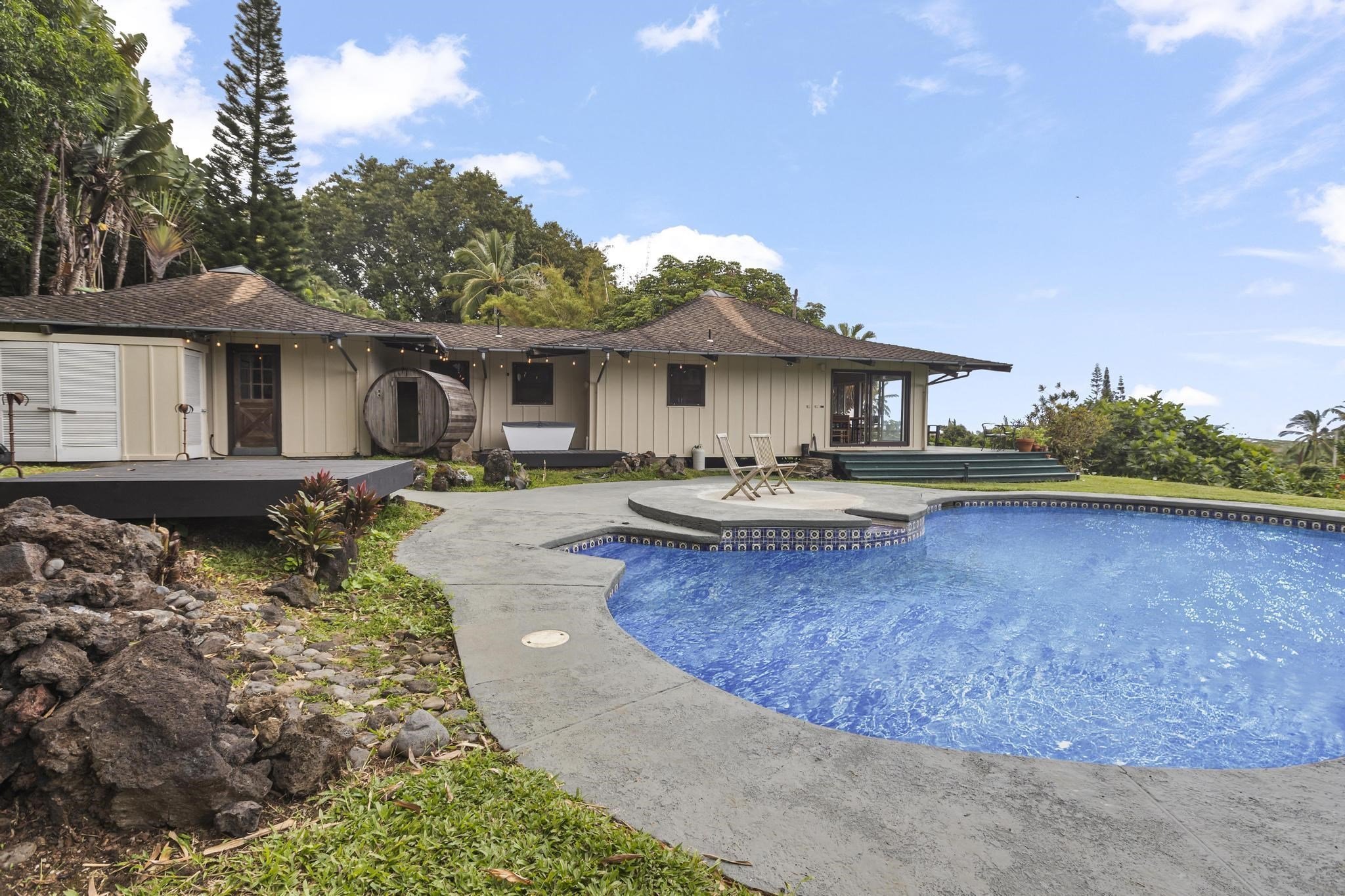Hidden Hana Shargrila is a lovely and peaceful home situated in a rural setting. The property offers the perfect opportunity for a getaway home or a rural lifestyle. The one-level home with its soaring ceilings and open-plan living room provides a spacious and comfortable environment for relaxation and entertaining. The over 1600sf deck allows for indoor/outdoor entertaining, creating a perfect setting for gatherings with family or friends. The swimming pool provides a refreshing oasis after a day of hiking the Hana trails or simply relaxing and soaking up the sun. The chef-inspired kitchen with its granite counters, wood cabinets, and pantry is perfect for preparing meals with local produce from Hana. The property's fruit trees and tropical flowers add to the property's beauty, providing a serene and tranquil environment. Overall, this hidden Hana Shangri-La offers the perfect opportunity for a peaceful and relaxing lifestyle away from the hustle and bustle of city/suburb living.