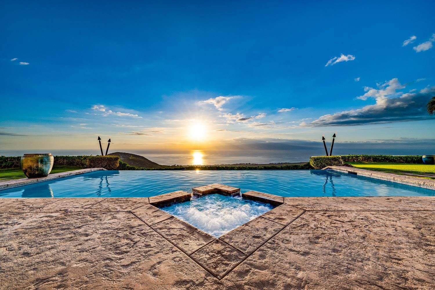 Perched at the top of tranquil Launiupoko, 81 Iliahi remains a landmark residence, now refreshed with thoughtful updates that elevate its already captivating design. The exterior has been newly painted, including the fascia, trim, and exterior doors. Inside, carpeting in the guest bedrooms and bonus room has been replaced with new laminate flooring, and all sliding-door glass has also been replaced. At nearly 1,000 feet above sea level, the home enjoys its own gentle microclimate and unobstructed 180-degree views of the Pacific, with Lanai and Molokai stretching across the horizon. The architecture continues to blend Balinese inspiration with luxurious functionality, expressed through four spacious bedrooms, a large dedicated office, and five beautifully finished bathrooms, each enriched with African Mahogany, Monkeypod, Venetian Plaster, and premium fixtures. The Great Room remains one of the home’s most unforgettable features. Folding pocket doors, with new glass, open wide to the covered lanai, creating a sweeping indoor–outdoor living experience and framing the panorama of the island of Lanai floating in the distance. The kitchen is equipped with top-tier appliances, custom wood cabinetry, and a large bay window positioned to capture the dramatic vista. A substantial center island offers both workspace and a relaxed gathering spot. Two serene Primary Bedroom Suites enjoy direct lanai access, spa-like baths with soaking tubs, and generous walk-in closets, while two additional Guest Suites provide comfort and privacy for family or visitors. Outdoors, the heated infinity pool remains a showpiece, warmed by an efficient solar system and set to overlook the rolling acreage below. Nearby, a separate, furnished guest house/ohana with a discreet outdoor shower offers an inviting retreat. The property is further supported by three 5,000-gallon water tanks with an independent delivery system, ensuring consistent access to both potable and agricultural water. Secluded, expansive, and newly renewed, this 35.7-acre Residential CPR estate blends elevated island style with natural beauty. 81 Iliahi remains a standout, both figuratively and literally, offering a private Maui sanctuary ready for its next steward. Don't miss the chance to make this fabulous property your own. Note this listing is a Residential CPR.