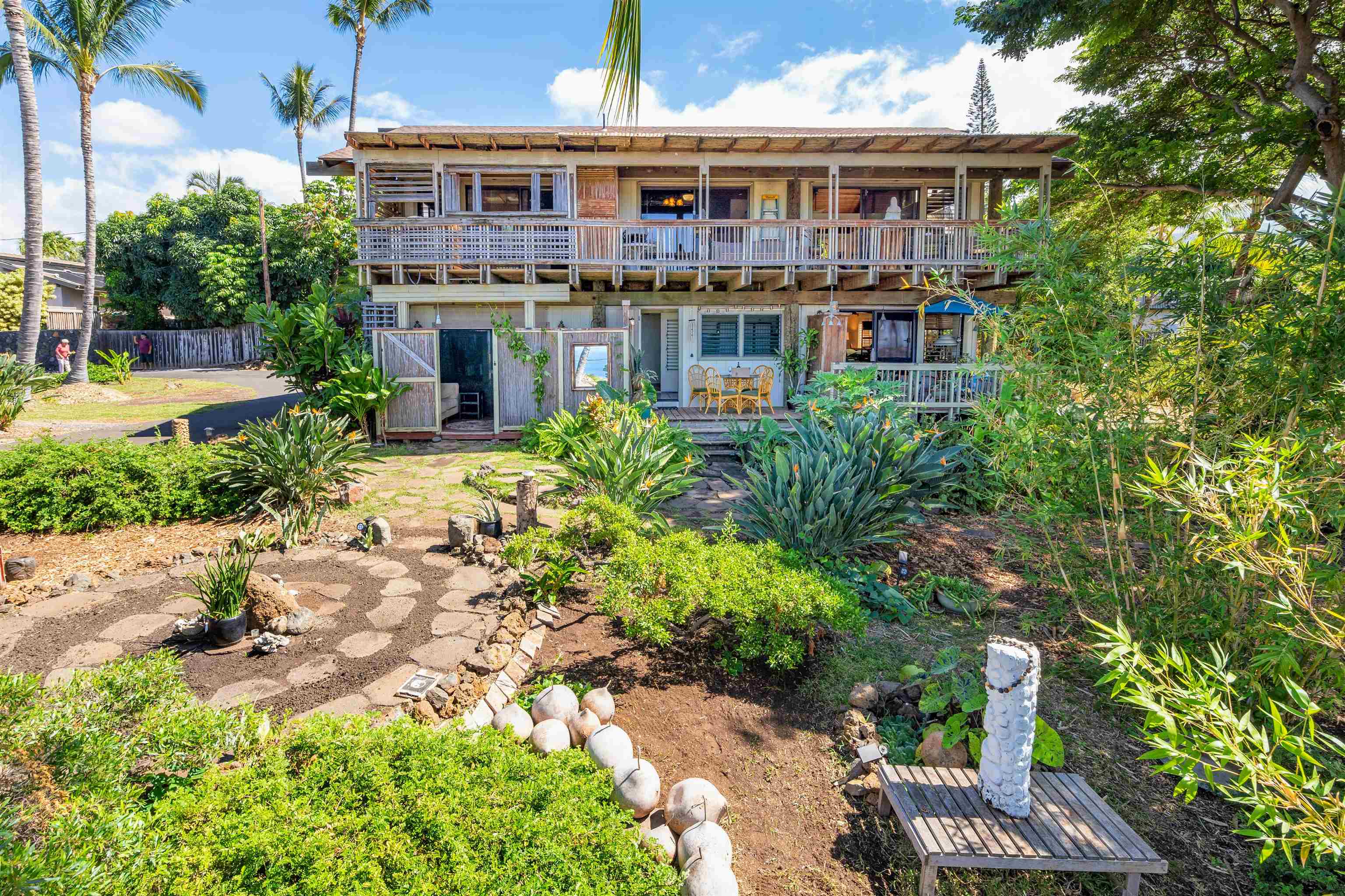 A one-of-a-kind tropical oasis with sweeping views of the vast Pacific Ocean. Enjoy breathtaking sunsets and cool, quiet evenings on the many Lanais in this 5-bedroom 4-bathroom Stiller Pole Home. The ground floor has three bedrooms, each with a separate entrance and two bathrooms. There's a jacuzzi tub that will relax your day away as you soak in the private garden views. Several covered lanais offer garden and ocean views and allow easy access to the garden areas with an infrared sauna and meditation area. The second floor has two bedrooms and two baths with a large deck overlooking the gardens and the Pacific Ocean. An open kitchen is perfect for cooking and entertaining. The large living room with high ceilings and sliding glass doors to the lanai offers endless relaxation opportunities while sipping your favorite beverage with friends and family. There's plenty of parking for the main house along with a thatched roof carport. A detached one bedroom one bathroom ohana located away from the main house offers an excellent rental opportunity. The cottage has an ocean view lanai, a separate laundry facility, a small workshop area, a large gated yard, and a parking area. The property has many open spaces and a collection of tropical flowers, native plants, coconut palms, bamboo, fruit trees, and other palms and plants. The secluded quiet of this nearly two-thirds of an acre has the feel of being in the country, you're just minutes to the restaurants, shopping, golf courses, Wailea and the beaches of Maui's southern coast.