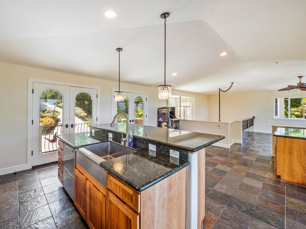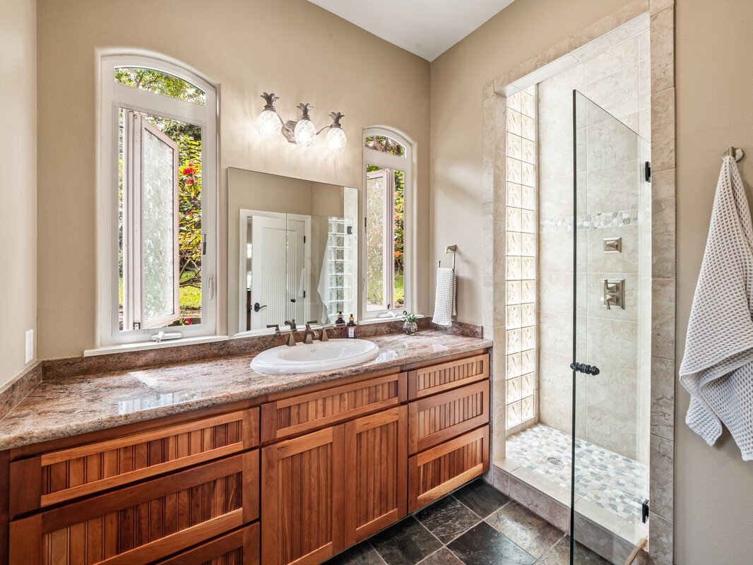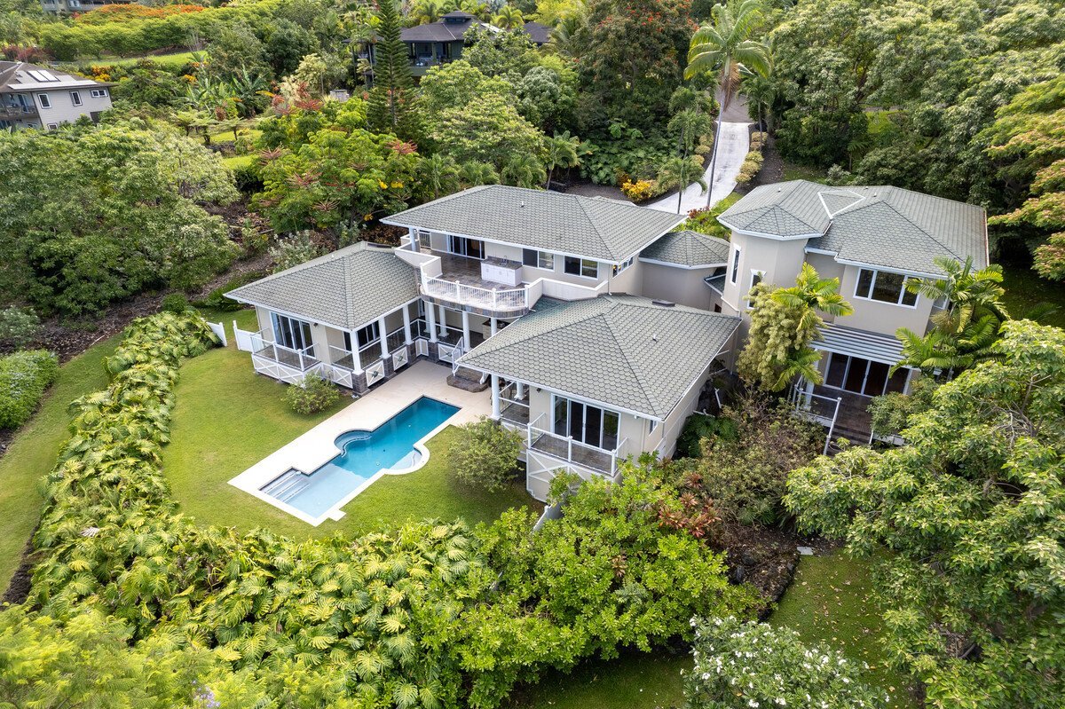 Nestled in a gated community, the luxurious estate is designed for flexibility like multi-gen living. Minutes from famous snorkeling at Kealakekua Bay, this property combines stunning ocean views, luxury finishes, and resort-like landscaping, exotic flowers & 16 varieties of fruit trees. The gourmet kitchen is an inviting space for gatherings with stainless steel appliances, granite countertops, & cherry cabinetry. One upper wing offers a wet bar, a refrigerator, dishwasher, granite counters, ample cabinets & wine storage, & a flex area, half bath, & lanai with ocean and sunset views. A large primary suite & guest room are located in a separate upper wing. The main floor features a spacious guest bedroom & bath, & a guest suite separated from the main house by the garage, both spaces offer private entrances. Also on the main floor - a large office as well as a reading room with built-in bookshelves, offering versatile spaces for work or relaxation. Multiple lanais invite you to soak in the views, enjoy the sparkling pool, and play on the lush green lawn. At over 3,700 sq ft, this home features multiple flexible areas, providing versatility and space for family activities and entertaining. Luxurious Cumaru & Stone Flooring Gourmet Kitchen - Stainless steel appliances, granite countertops, cherry-wood cabinetry. Impressive Wet Bar - Refrigerator, dishwasher, granite counters, ample cabinet space, and a wine storage area. Office and Reading Room Outdoor Living - Newly resurfaced pool, multiple lanais, open balconies, and 2 outdoor wet bars. Convenient Parking - Resurfaced driveway & parking area, and 2 car garage. Resort-Style Landscaping - bird of paradise, torch ginger, plumeria, pomelo, lemon, orange, grapefruit, bananas, coconut, starfruit, mango, avocado, fig, pineapple, and dragonfruit. The best of Island Living on the Big Island! See virtual tour https://my.matterport.com/show/?m= https://player.vimeo.com/video/980050504
