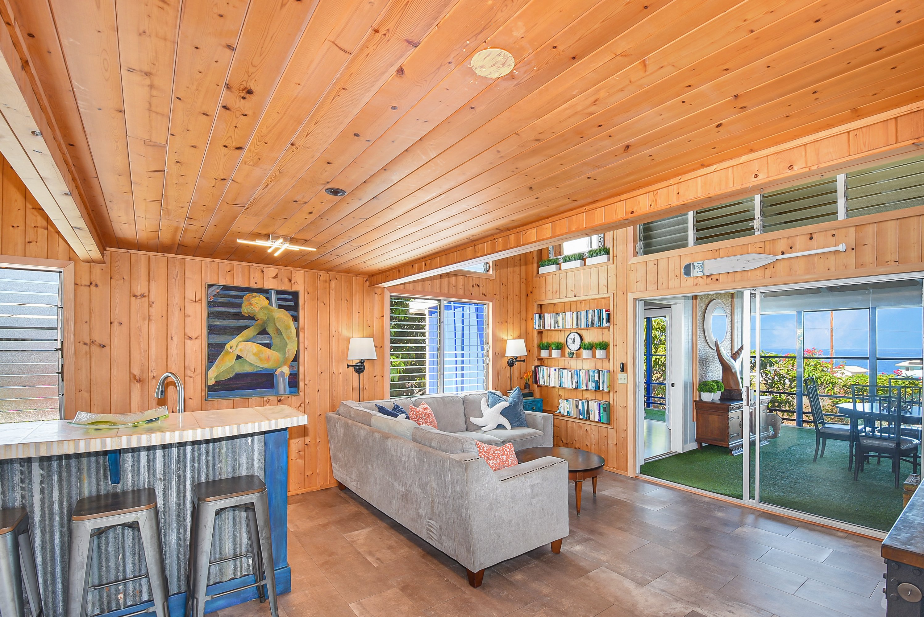 Built with relaxation in mind, the home’s seamless indoor-outdoor flow captures Hawaii’s year-round climate, allowing nature’s beauty to fill every room. This turnkey-ready property also features an eco-friendly rainwater catchment system, triple-filtered with UV light, providing a sustainable water source. Inside, natural pine walls bring warmth & resilience, perfect for open-air living in Hawaii’s sea-salt climate. Unique custom finishes add a timeless, artistic quality, giving the space a distinctive character. The main bedroom offers stunning Papa Bay views framed by French doors that bring the ocean horizon into view from a king-sized bed. A cozy loft complements the main bedroom, while the recently renovated kitchen & bath add modern comfort to this classic Hawaiian escape. A convenient bonus bathroom on the lower level lets you freshen up after a day by the beach, keeping the sand outside.