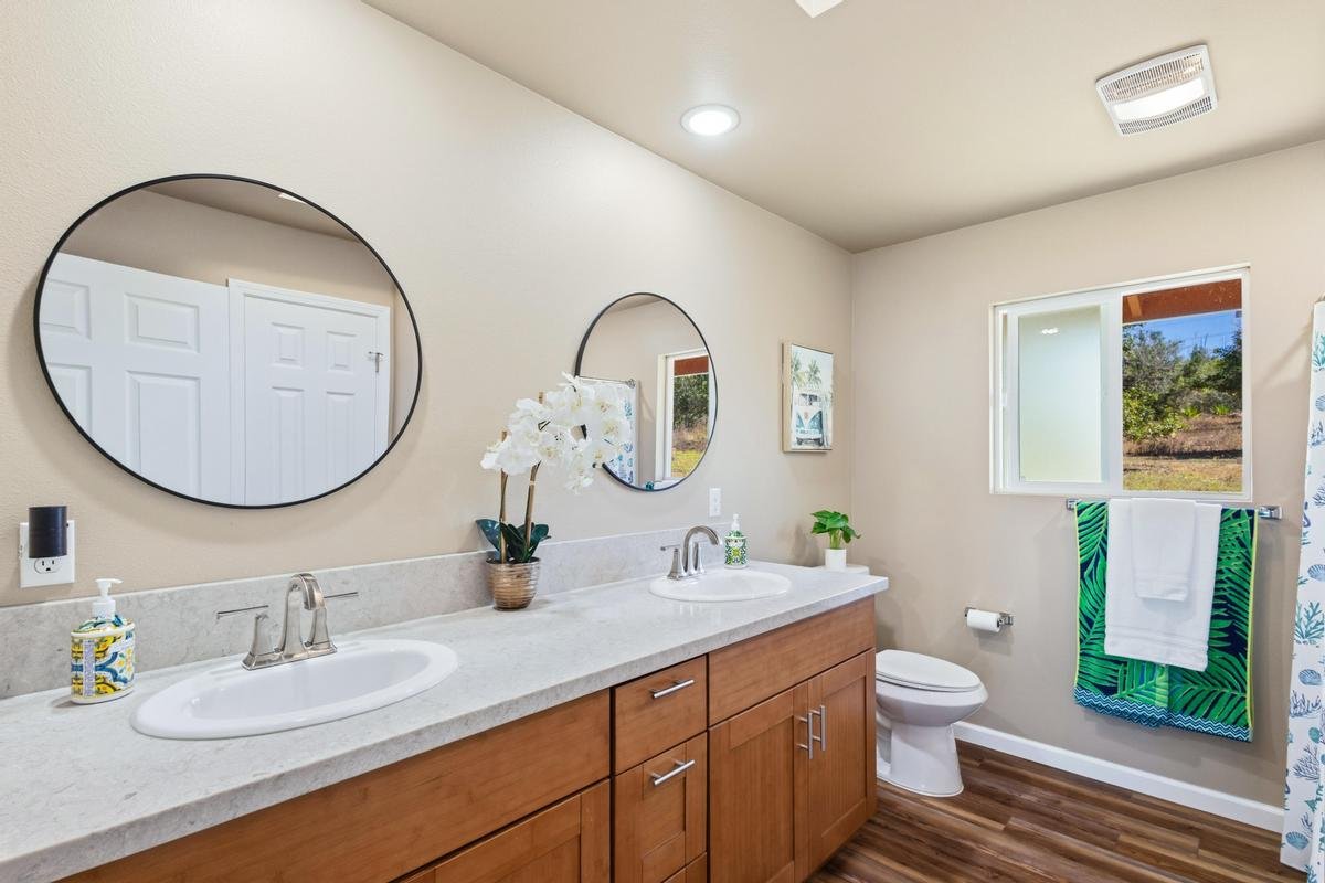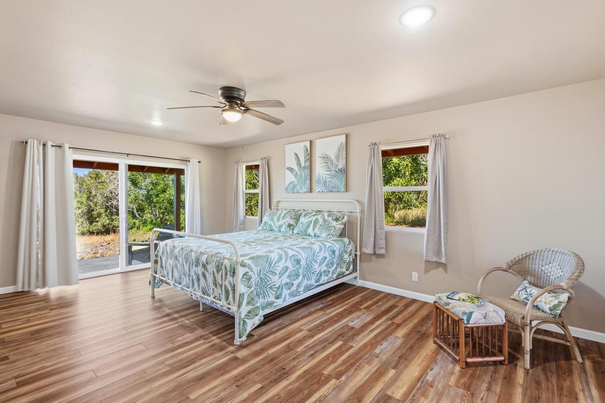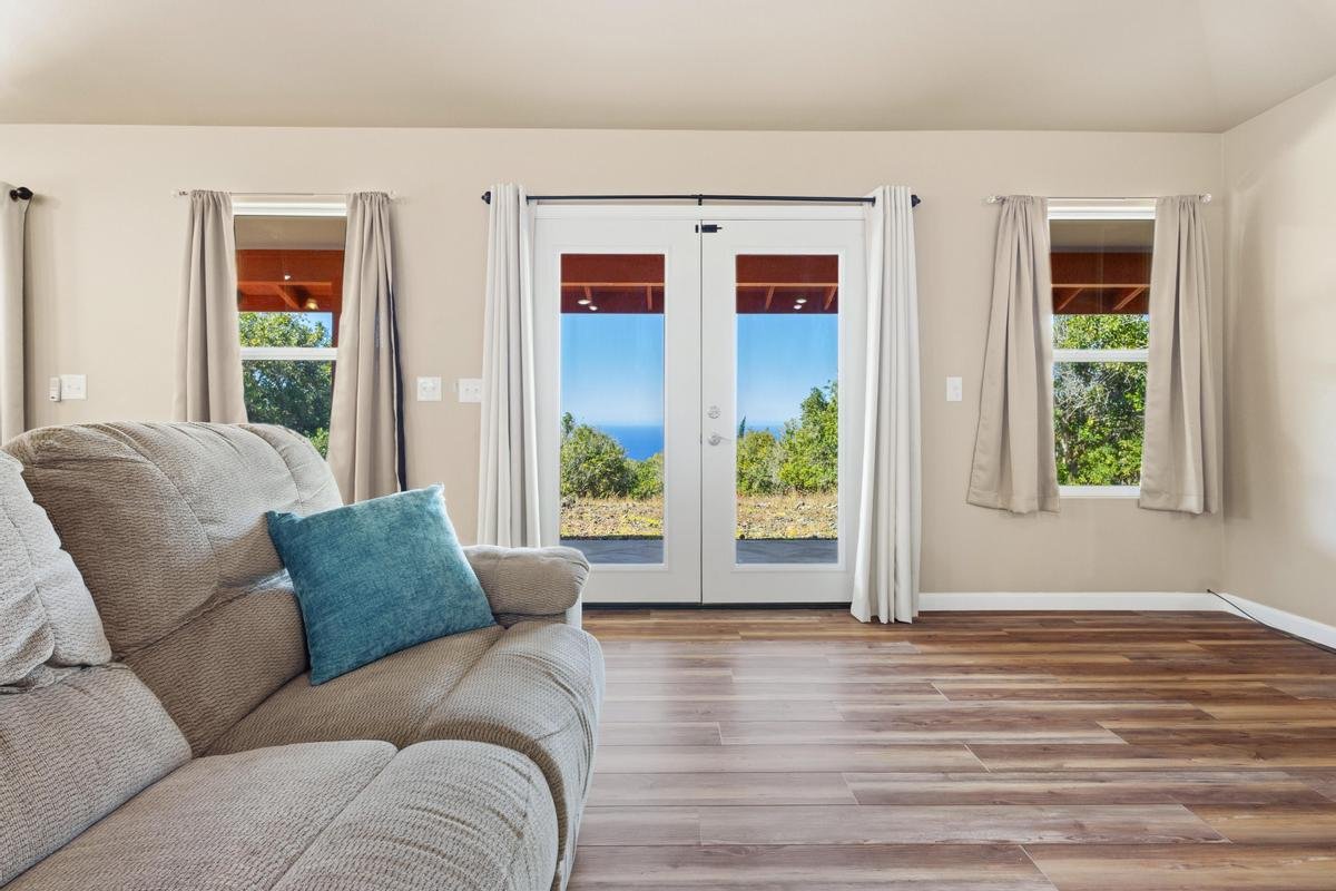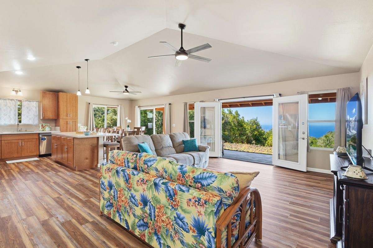 2025 NEW, PRISTINE HOME, MACNUT FARM, OCEAN VIEWS ON PRIVATE 8.64 ACRES Property is gated & fully fenced. Approximately 360 producing Macnut Trees. Macnut grove plus 9 avocado trees, orange and mango trees. New 10,000 gal. water tank w/UV filtration system. Home is furnished move in ready. Open and airy living area leads out to a large lanai for your outdoor living and al fresco dining. Living and dining area features vaulted ceilings, pendant lights over the spacious kitchen island with cabinets and bar seating. Quartz counter tops with backsplash, bamboo style soft close cabinets ceiling height plus a pantry. New stainless-steel appliances. Living room is complete with French doors and upgraded sliders and windows for natural light and views. Huge ensuite with ocean views, large walk-in closet w/shelves. Slider that opens onto the lanai. Ensuite bath with a skylight, dual sinks, quartz counter, bamboo soft close cabinets, linen closet and a walk-in shower. Private guest bedroom and a full guest bath with quartz counter, bamboo soft close cabinet and a tub/shower. Laundry room with a skylight, shelves, storage closet, new Samsung Washer & Dryer plus a laundry sink. Hybrid AO Smith 50 gal. water heater. Other features include luxury vinyl flooring throughout new ceiling fans recessed lighting Clean and pristine move in ready. Private lot with easy access to the Hwy. Live and work your own Macnut farm with income. Potential for much more planting, raised gardens, etc. Nearby beach, restaurants, Sat open market, post office, markets, gas stations. A short drive to Kahuku National Park.