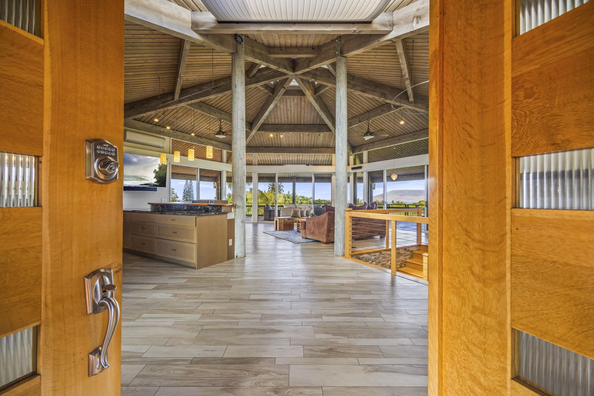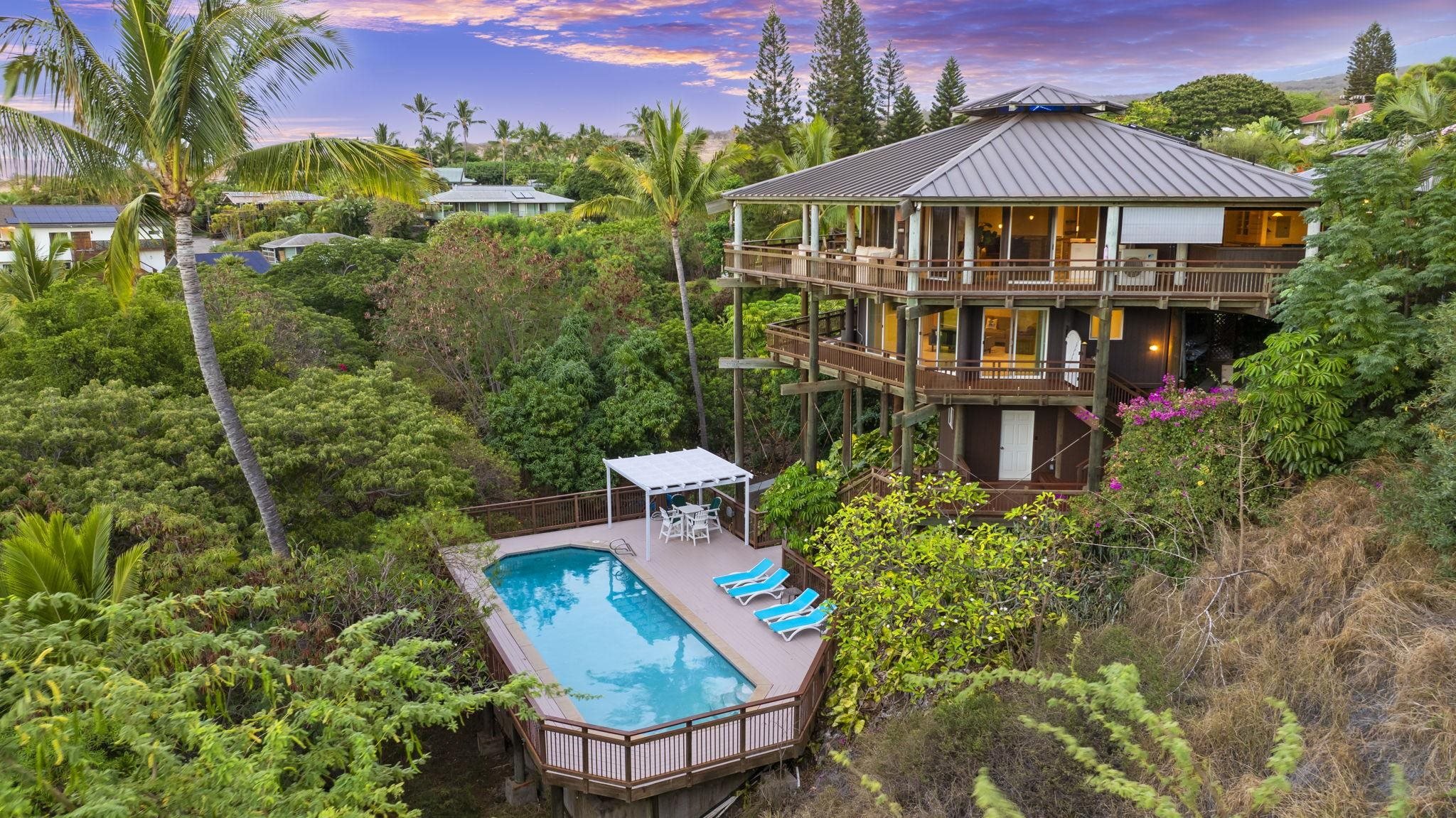 Step into an extraordinary Modern Pole House, gracefully perched at the top of Maui Meadows, where breathtaking panoramic ocean views and vistas of the neighboring islands await you. Meticulously remodeled and completed in 2021, this architectural masterpiece seamlessly blends contemporary elegance with the unique charm of the original Frank Stiller design. This property is very private, with stunning ocean views and amazing Maui sunsets visible throughout the home. Unwind in the serene ambiance by the saline pool, perfectly positioned for both privacy and tranquility. The exterior boasts a lush, large front yard covered in golf course-quality grass, adding to the home’s impressive curb appeal and offering a perfect space for play, relaxation, or entertaining. Surrounded by a tropical landscape with mature fruit trees—including orange, mango, banana, and papaya—the property embodies the enchanting allure of a private treehouse retreat. With over 1,700 square feet of expansive wraparound lanais, automatic sprinklers, and outdoor landscape lighting, every detail enhances the beauty of this tropical oasis. Step inside to a bright, airy interior showcasing soaring open-beam ceilings, generous windows, and an effortless indoor-outdoor flow that invites cooling cross breezes. Each room is equipped with split A/C systems, ensuring your comfort in every season. The primary suite is a true sanctuary, offering double closets and a luxurious en-suite bathroom with dual sinks, two spacious showers, and two toilets. Elegant double LED-lit vanity mirrors enhance the sophistication of this exquisite retreat. Luxurious porcelain tile floors and beautifully crafted monkeypod, mango, and cypress wood counters add a refined, natural touch throughout. Downstairs, the lower level offers additional living space with a full bathroom, kitchenette, and its own washer/dryer hookup—ideal for guests or extended family. Additionally, this area includes a 4th bedroom with separate access, creating the perfect opportunity for a flexible use space that could serve as a private office, guest suite, or even a separate ohana. Embracing sustainability, the home features 34 fully owned PV solar panels and an upgraded septic system. For pet lovers, there's a fully fenced area for your furry companions to enjoy the outdoors safely. A detached garage provides a versatile workshop area with a half bath, and ample parking is available via upper and lower driveway access. Whether you’re lou