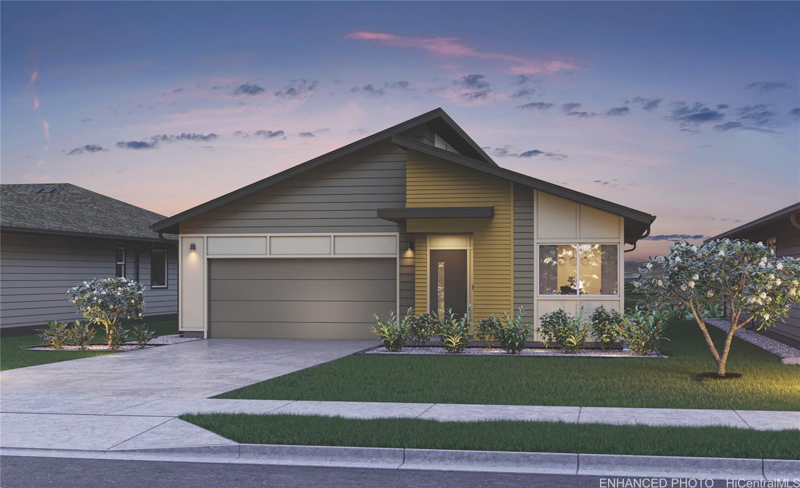 Open & light, this modern design 1-story single-family home offers 3 bdrms, 2 baths and is a local favorite. The spacious living and dining room with a vaulted ceiling is open to the kitchen with a long peninsula countertop offering additional seating. and flows out to the rear covered lanai and backyard. The modern style kitchen is designed with white cabinets with soft-close doors and drawers and lots of storage, beautiful quartz countertops, a Kohler single basin vault sink and KitchenAid® stainless steel range/oven, micro-hood, and dishwasher. The Primary bedroom offers a large walk-in closet with an ensuite bathroom featuring a step-in shower. dual vanity sinks and solid surface countertop. Additional features to this home include: Split ACs in living area and bedrooms, vinyl plank flooring throughout the living area, kitchen, hallway and bathrooms, plush carpeting in bedrooms, 2 car attached garage with laundry sink and automatic garage door opener, PV & EV ready, 10-year Limited Structural Warranty, Ho'opili Urban Garden/landscaped yard with automatic irrigation system and the Home is Connected-Smart Home System. Home includes the Ikena + Cool Package Upgrade.