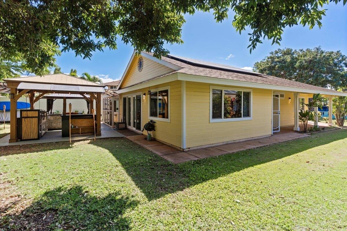Nestled on a peaceful cul-de-sac in the sought-after Pi’ilani Villages neighborhood, this beautifully remodeled single-level Kihei home offers the perfect blend of comfort and modern elegance. Featuring three bedrooms and two bathrooms, the thoughtfully updated interior is designed for both everyday living and effortless entertaining. Step inside to an inviting open-concept layout, where vaulted ceilings and recessed lighting create an airy and light-filled ambiance. Striking vinyl flooring complements the warm color palette, while abundant natural light pours in through multiple windows, enhancing the home’s welcoming atmosphere. Designed for seamless indoor-outdoor living, the main gathering space flows effortlessly through sliding glass doors onto a private patio. The well-appointed kitchen is a chef’s delight, featuring an island bar with chic pendant lighting—ideal for casual dining or entertaining guests. Outside, the expansive backyard is a tropical oasis, complete with mature trees, lush greenery, and two raised garden beds. A spacious gazebo provides the perfect setting for al fresco dining and weekend gatherings. Modern upgrades enhance the home’s appeal, including a new 4-ton Lennox central air system, 24 seller-owned photovoltaic solar panels with two LG backup batteries. Additional conveniences include four exterior storage cabinets, providing ample space for outdoor gear and essentials. This exceptional Kihei residence is move-in ready and offers the perfect combination of style, comfort, and convenience.