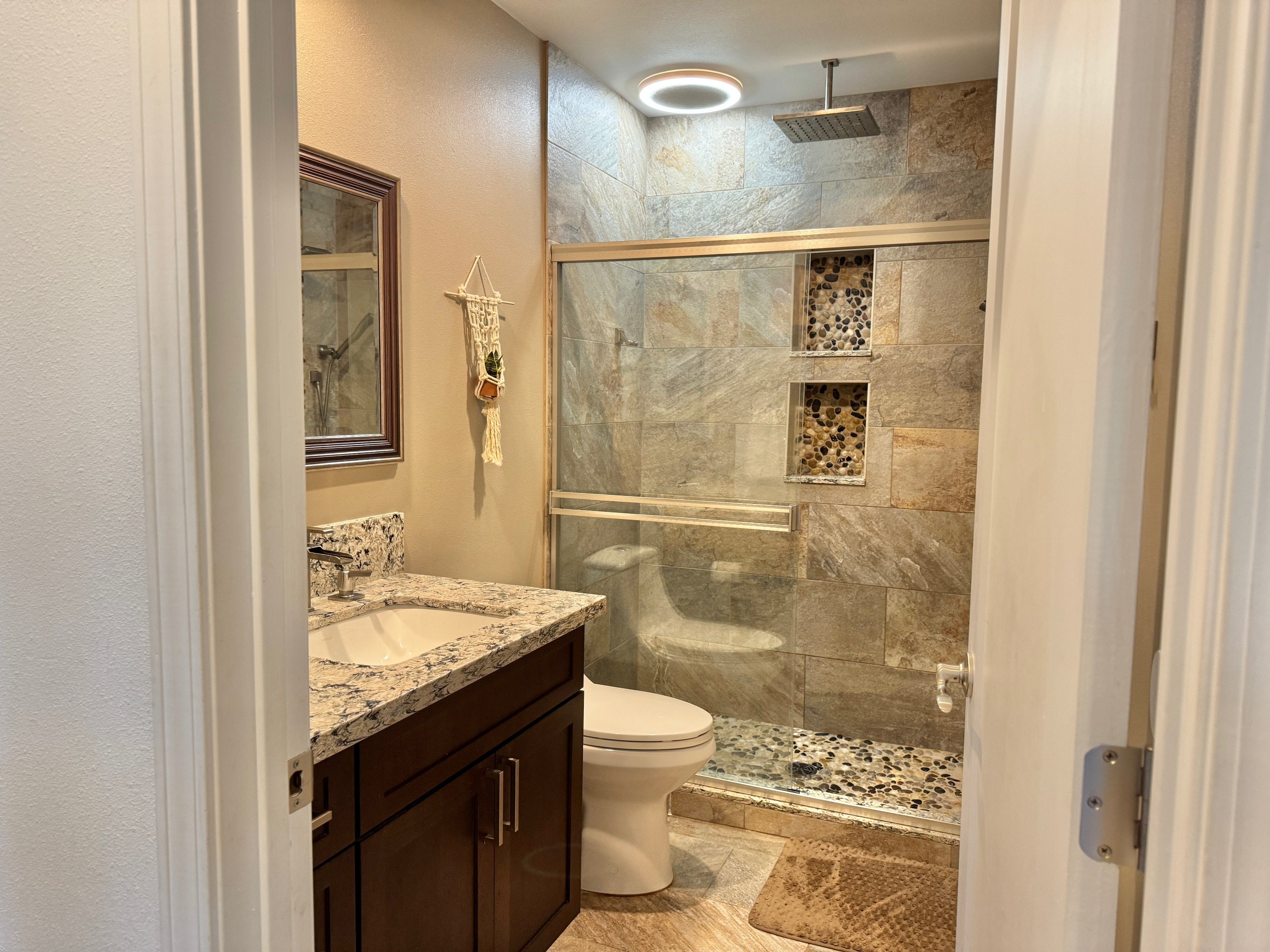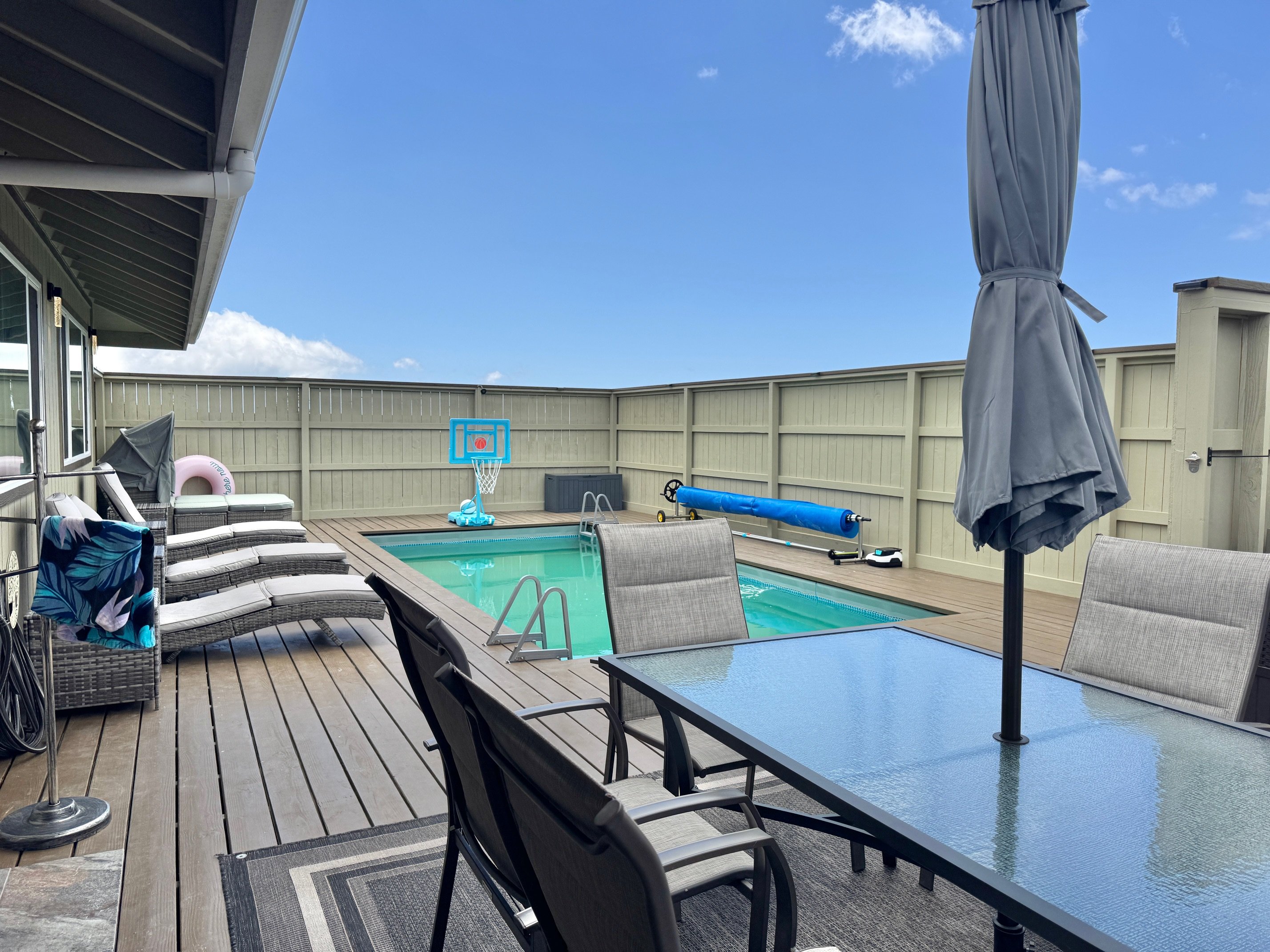 This 2020, 3 bedroom 2 1/2 bath well maintained home, remodeled with exceptional upgrades and outdoor living in 2024, has 2 acres fenced with wood, is 2,395 sq ft of interior living space, a 14,400 gallon catchment tank with tankless goundforce pump, dual 20" filters, a UV purification system, and a breathtaking panoramic view of South Point, coastline, and horizon. The open concept kitchen flows seamlessly into the adjoining dining/living area: a space great for entertaining family and friends. The kitchen has all wood cabinetry with soft closing drawers and doors. There's two pantry cabinets with a hideaway door, built in trash bins, a 9 foot island that includes a beverage/wine cooler, and the kitchen floors are finished with travertine tile, the counter tops with quartz stone with a full quartz backsplash extending up to the cabinets and window. Appliances are all GE stainless steel, including a touchless kitchen faucet, new garbage disposal, and pot filler for added convenience. There's high quality bamboo wood floors throughout the home. Both bathrooms are luxuriously finished with full porcelain tile walk in showers with rainfall shower heads, mosaic accent bands, dual soap niche, triple diverters, and stainless steel framed glass doors which continues and blends with the upscale design from the kitchen. The master suite includes a large walk in closet. The 2024 renovated laundry room has a new Maytag washer and dryer, porcelain tile floors, solar hot water heater for efficient energy savings, and additional wood cabinets. Also added in 2024 is an 18'x23' movie room, an additional 1400 sqft deck , 6 person hot tub, 82 jets ozonator, a 12 x 24 above ground solar heated salt waterpool with cover and robotic vacuum. For 360 go to: https://hovrrealestate.com/360/MLS726534/index.html