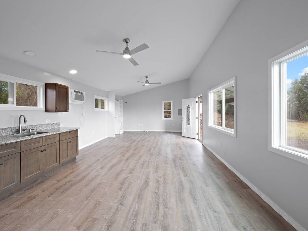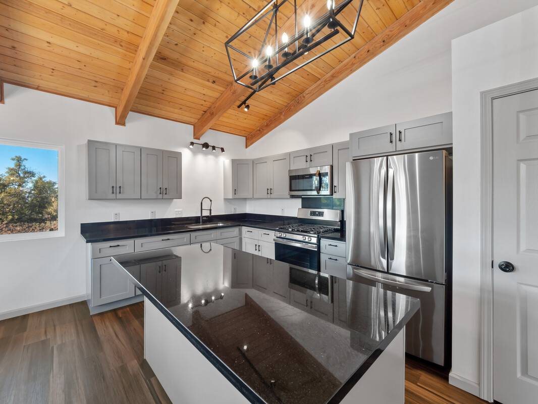 On the other side of the property is an unpermitted studio cabin, approximately 750 sq.ft., also with gated entry. Multiple uses are possible for this space with a kitchen & 1 bathroom, which includes a refrigerator, oven & microwave. This additional cabin was built in 2022, and utilizes a cesspool.