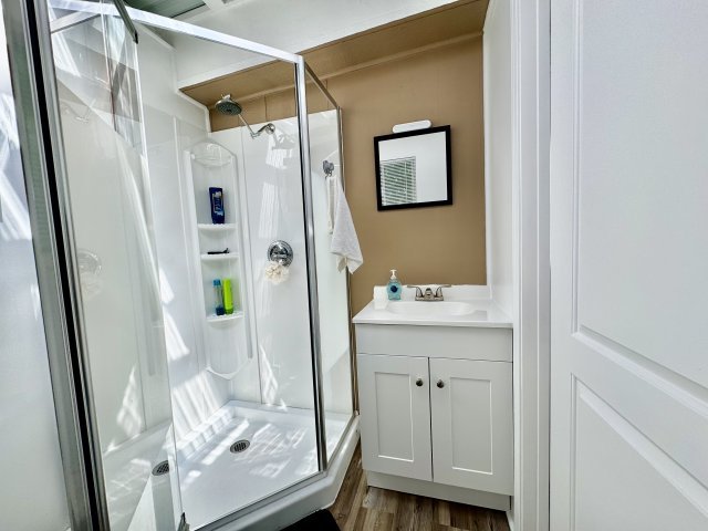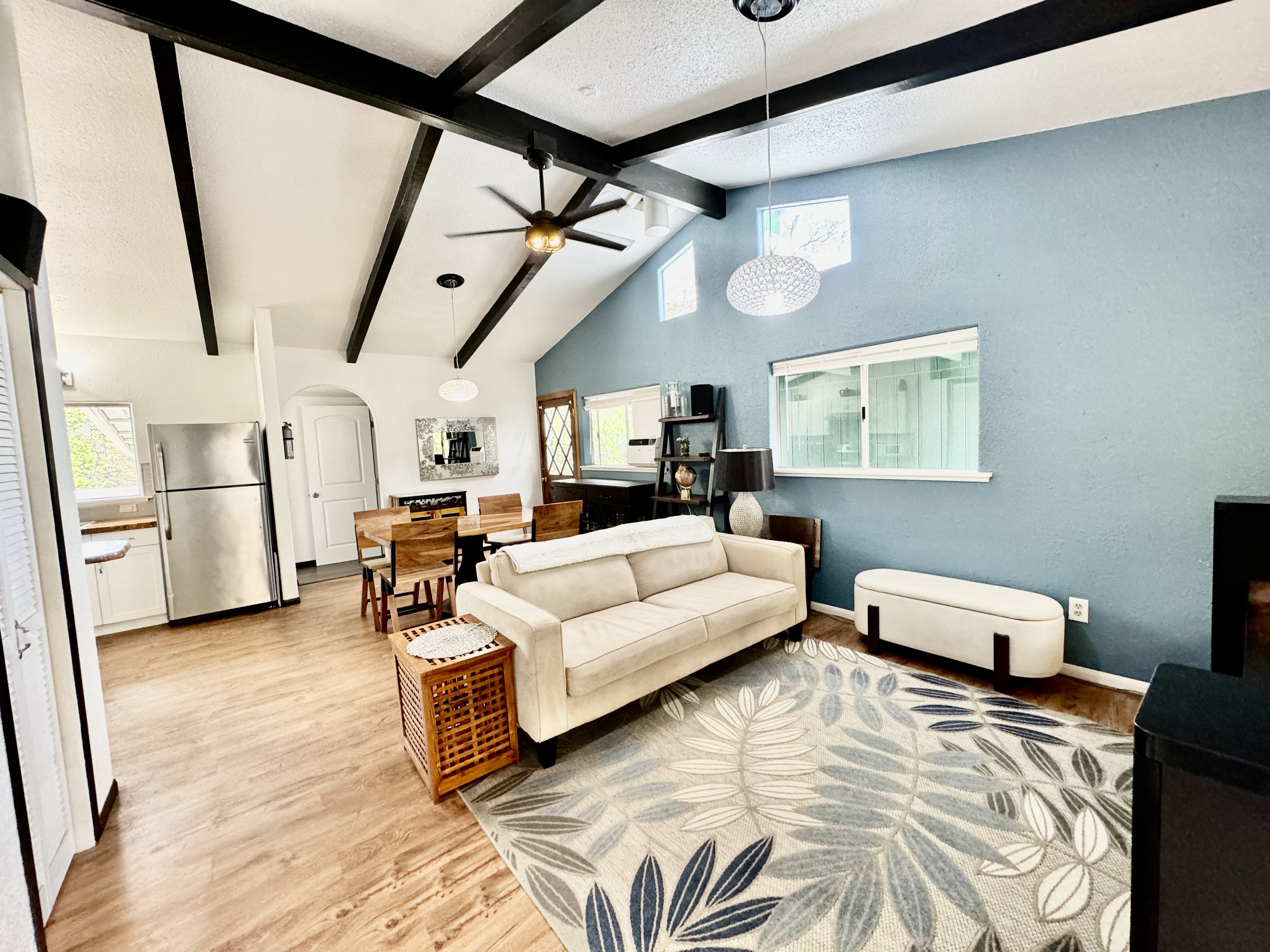 VIDEO TOUR LINK: https://player.vimeo.com/video/998770. Lush, wooded area in the lower 1/3rd of Ocean View, this property has a main 2 bed/1 bath house & a separate studio, (both furnished) concealed from the road down a long driveway surrounded by lush foliage. The talented owners have spent much time restoring, improving & modernizing the home & studio as well as the 1 acre of land on which it sits. Enjoy the following features: * Gated entry & fully enclosed fencing around most of the property. * Electric run underground. * Split gravel driveway for easy access in & out w/expansive concrete drive in front of the house. * Level cleared areas in back w/dog enclosure and handmade concrete/brick BBQ Smoker. * 15x19 refurbished lanai w/sleek cable railing & peek-a-boo view of ocean/coast & stairs leading to yard. * New exterior paint, some new gutters & 2 raised garden beds. * Covered front porch, new front door & new french drain in front of studio. * Catchment tank w/support & cover & 275 gal. plastic water container. * Outdoor cooking station w/tile counter, 2 propane burners, large toaster oven & propane grill. * 12x12 shed w/electric power & chest freezer, smaller tool shed & a 10X20 canvas carport. * New interior paint throughout & new vinyl plank floors in both beds and studio. * Dramatic beamed ceilings. * Open kitchen with rich mango wood countertops, crisp white cabinetry, stainless appliances & a peak of ocean from window over sink. Pantry closet off kitchen. * Modern bathroom w/walk-in shower & stacked washer/dryer. * 1 bedroom on main leven next to bathroom & larger bedroom below main level. * LG dual inverter window AC unit w/wifi control. * Newly finished separate studio w/private entrance, new roof, stainless sink & counter. * New, modern shower room attached to the studio with a spacious walk in shower w/glass door, sink w/cabinet w/clear sunlight ceiling panels & solar lighting.