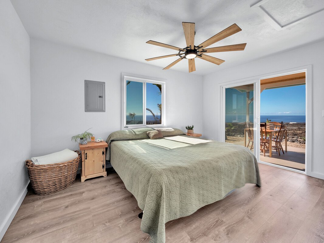 MOTIVATED SELLER OFFERING ONE YEAR HOME WARRANTY! This lovely , permitted 1 bedroom home located in Hawaiian Ocean View Ranchos on a HUGE 3 acre lot, has quite a lot to offer including rental income from an additional cabin. Main home was Owner-Builder built just over 1 year ago and looks amazing! LVT Floors 60" Ceiling fans 42" Custom Cabinetry Marble Tile Countertops Mosaic Backsplash Stainless Steel Appliances Gas Stove w/ Air Fryer Lower Oven Microwave Vent Hood Decorative Concrete Lanai Beautiful Landscaping Solar Hot Water Heater Washer Covered 10,000 gal Catchment Tank Fenced Garden, Bananas, Lemon, Lime, Orange, Coconut, Ice Cream Bean, Dragonfruit, Moringa Tree, Papaya, Rainbow Eucalyptus, Blackberries, Plumeria, Kukui Nut, Pineapple & Watermelon! The 240sf additional, insulated structure boasts: Gas Range/Oven Full Size Fridge Custom Cabinetry Tile Countertop Mosaic Tile LVT floors High Ceilings Loft/ Storage area Big Lanai Lots of Windows Barn Door Bath Entry TOYO Toilet Priced to SELL! No HOA fees! Don't let this one slip away! SELLER CURRENTLY HAS A RENTER ON A MO/MO LEASE IN THE ADDITIONAL CABIN, PAYING $775/MO INCLUDING WATER & ELECTRIC. Renter is willing to stay on with a lease.