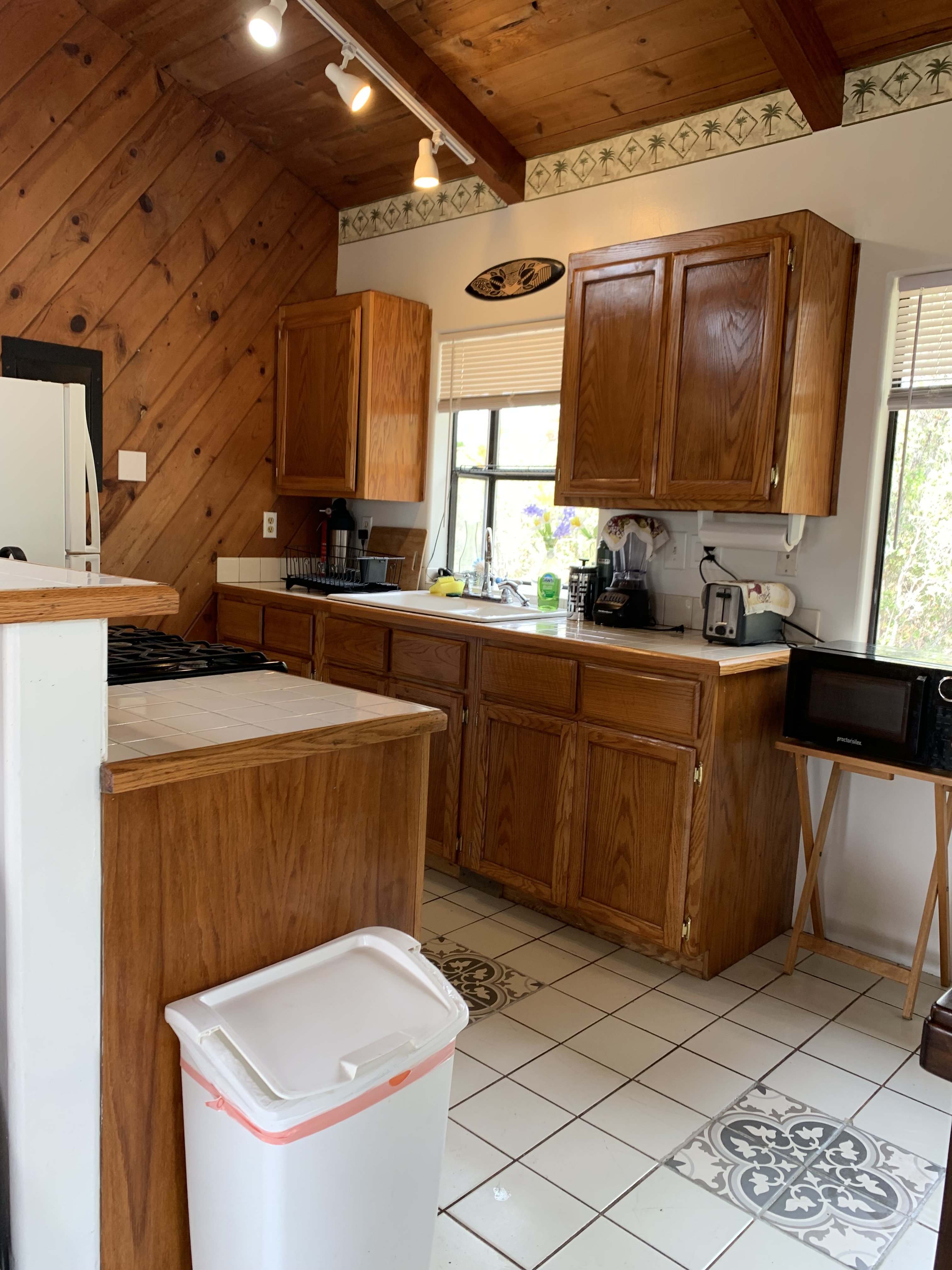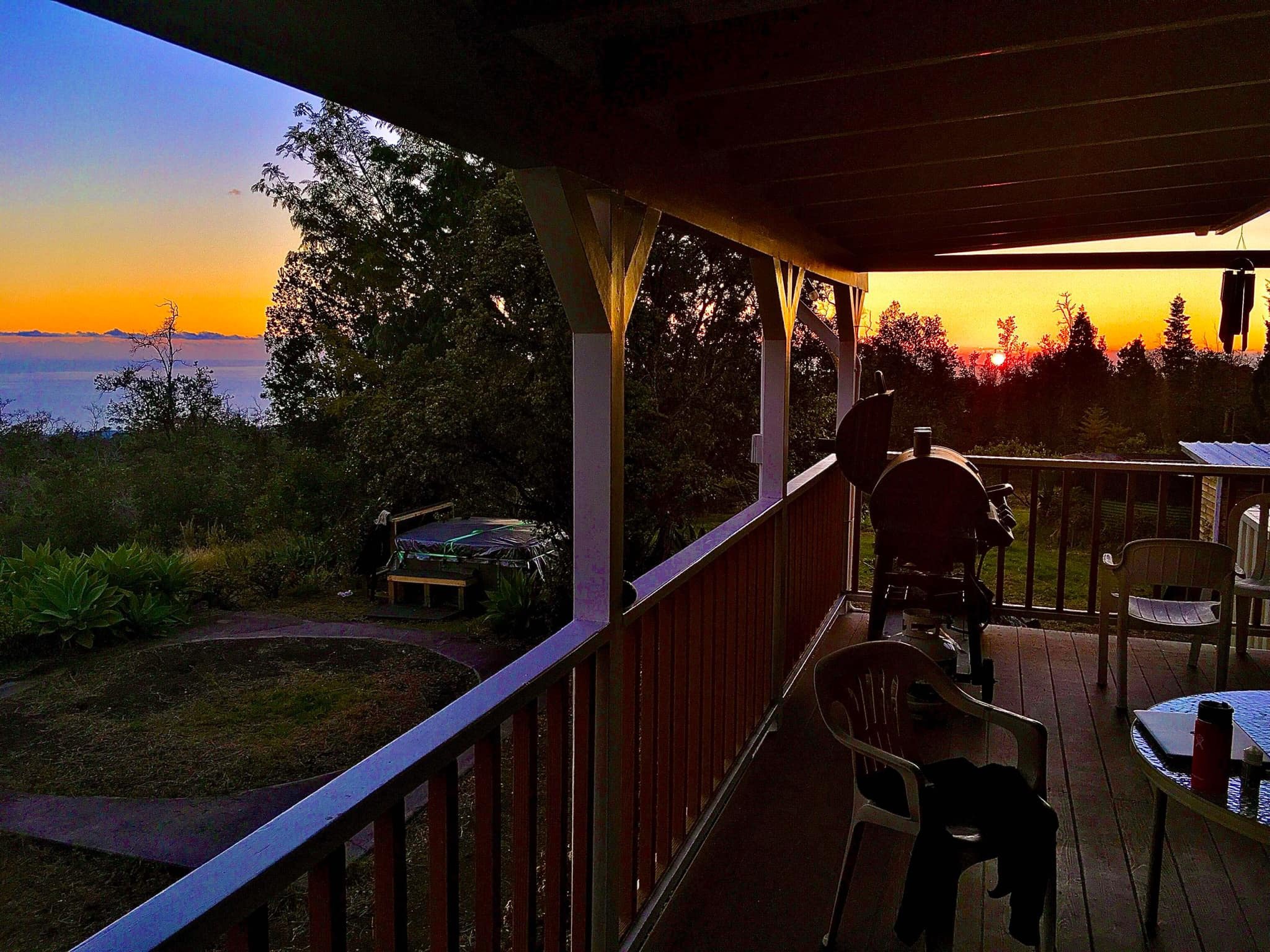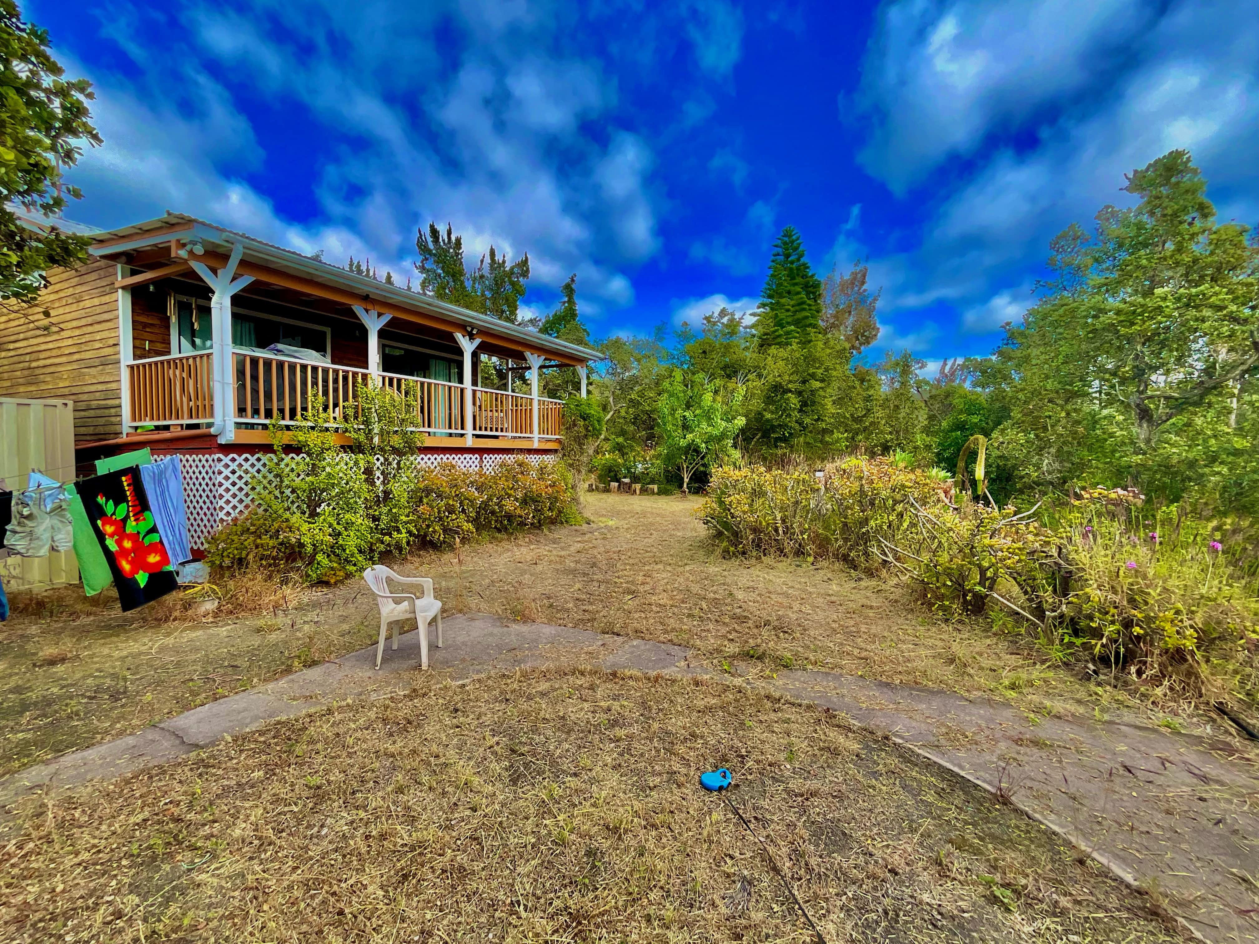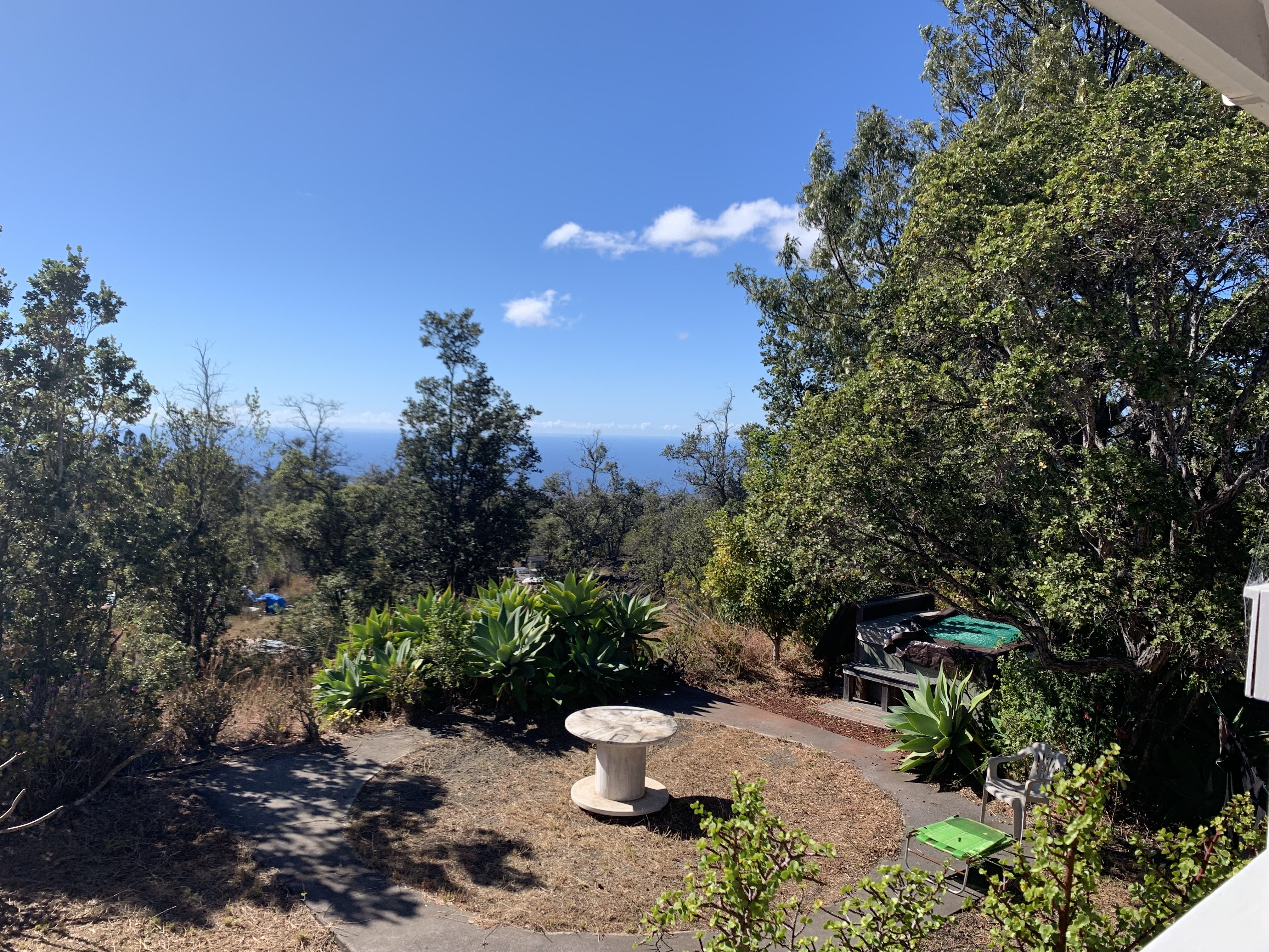 This property has plenty of curb appeal. The charming, custom-made home on 2 acres is on a quiet cul-de-sac about midway in the subdivision, together with an additional Cottage. The gated driveway is surrounded by trees and flowers and leads to the well-kept home. The comfortable and furnished home features a warm Interior with high-beamed wooden ceilings and an open floor concept. The tiled entry leads to the kitchen, with updated appliances, and to the dining area. Great Ocean and Sunset Views can be enjoyed from the spacious, covered lanai w/ Gas / charcoal BBQ grill included. Exterior walls are made from Redwood and Cedar, sanded and refinished w/UV sealant. Future expansion of this home is possible on the ocean side of this home. Large workshop area downstairs with lots of storage and a Whirlpool front load washer, small chest freezer plus water heater. Lorex security system w/camera, Simply Safe security system with subscription, back-up power for security system/internet are Solar panels, inverter, batteries, Fiberoptic internet connection. Outdoor hot tub/jacuzzi amidst mature trees, coffee and many other tropical fruit trees, such as Avocado, Lemon, Mango and more. Colorful flowers are everywhere to brighten your day. Behind the house is a 16,000 gallons water tank, a separate pump house, with a new well pump and an installed septic tank. An additional storage shed is towards the back of the property. The separate detached 16 x 20 Cottage is currently occupied, has it's own washing machine and it's own Fiberoptic Internet (Hawaii Telcom), with a separate line and account. The attractive cottage is privately located and was completely remodeled in 2024.