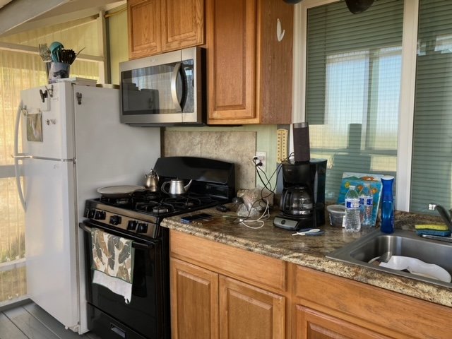 * ADA electric stair lift chair on staircase leading into the kitchen from the garage * Induction cooktop on the range/oven * Large pantry in the spacious kitchen * Expansive granite countertops and small island, pendant lighting * New dishwasher, all stainless steel appliances * Ocean views from the windmills at South Point almost around to Milolii * Oversized primary bedroom with double closets, mirrored doors * Very large accessible primary bathroom with roll-in glass block shower * Second bedroom could also be office space * Freshly painted interior * Attached two-car garage with opener & laundry area * Large 20,000 gallon water catchment tank * Gated with keypad for controlled entry, custom rock pillars on each side * Corner stakes are visible, so no re-staking or survey paid by seller * Permitted studio ohana has attached greenhouse, indoor/outdoor kitchen * Separate storage shed, perfect for garden tools, etc. * A 360 degree video tour is available at the top of the listing