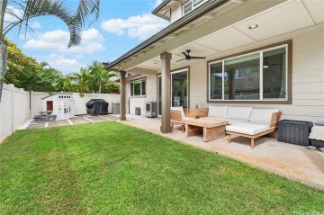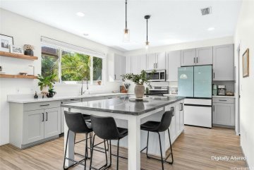 Welcome home to this beautifully updated single level 4 bedroom 2 bath residence, offering 1,840 sq ft of living space, tucked away in a quiet cul-de-sac in desirable Mililani town! Extensively improved, this home features a fully renovated kitchen with custom cabinetry, quartz countertops, a large center island and all new appliances. Other upgrades include vinyl plank flooring throughout, three split A/C units, double-pane vinyl slider windows and a brand new roof. The flexible floor plan includes a dedicated office that can easily be converted into a 5th bedroom as well as an enclosed workshop/storage/laundry area, providing added functionality and versatility. Step outside to enjoy mature mango, avocado, tangerine, and dragon fruit trees, creating a lush backdrop and offering a delightful seasonal fruit harvest. Conveniently located near Mililani Town Center, schools and easy freeway access, this home blends comfort, function, and modern style!