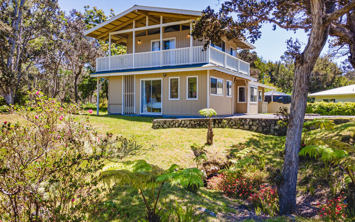 Stairs lead to huge Primary Suite, ensuite bath and walk in closet. It's like being in a tree house with views out to the treetops from the wraparound deck. Sit and enjoy the breezes, birds in the trees and cool climate of Volcano. Forest views to a 2+ acre common area, "Park E", are visible from the rear of home. This area creates a buffer between home and the lot behind on E KaOhelo.